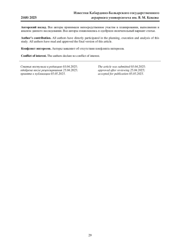 Цель исследования - изучение влияния инновационного комплексного удобрения Микровит Стандарт на продуктивность гибрида кукурузы в условиях предгорной зоны Кабардино-Балкарии. Перед исследователями стояла задача выявления дозы и сроков внесения комплексного удобрения Микровит Стандарт для выращивания кукурузы на зерно. В ходе проведенного в 2022-2024 гг. исследования установлено, что дозы и сроки внесения оказывают влияние на формирование урожая и качество зерна кукурузы. При обработке инновационным комплексным удобрением Микровит Стандарт (1,0 л/га) в фазах 5 и 9 листьев + N30Р30K30 отмечалась максимальная высота растений (226,2-227,8 см), где прирост высоты растения составил 11,6-12,2%; высота прикрепления початка достигла отметок 68,7-69,2 см, где разница с контролем составляла 8,7-9,2 см, или 14,5-15,3%; длина початка увеличилась до 20,6-20,8 см, что выше контроля на 14,4-15,9%; количество зерен в ряду увеличилось в пределах 31,1-32,3 шт., или на 3,1-4,3%; количество зерен в початке увеличилось с 428,8 до 452 шт., что выше контроля на 35,8-60,0 шт., или на 9,4-15,3%. В полевом эксперименте максимальная урожайность получена при обработке удобрением Микровит Стандарт (1,0 л/га) в фазе 9 листьев + N30Р30K30 (69,7 ц/га), что выше контроля на 24,3 ц/га, или на 53,6%. Наименьшая урожайность (45,4 ц/га) отмечалась в контрольном варианте без применения комплекса Микровит Стандарт и минеральных удобрений.