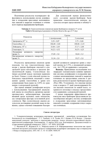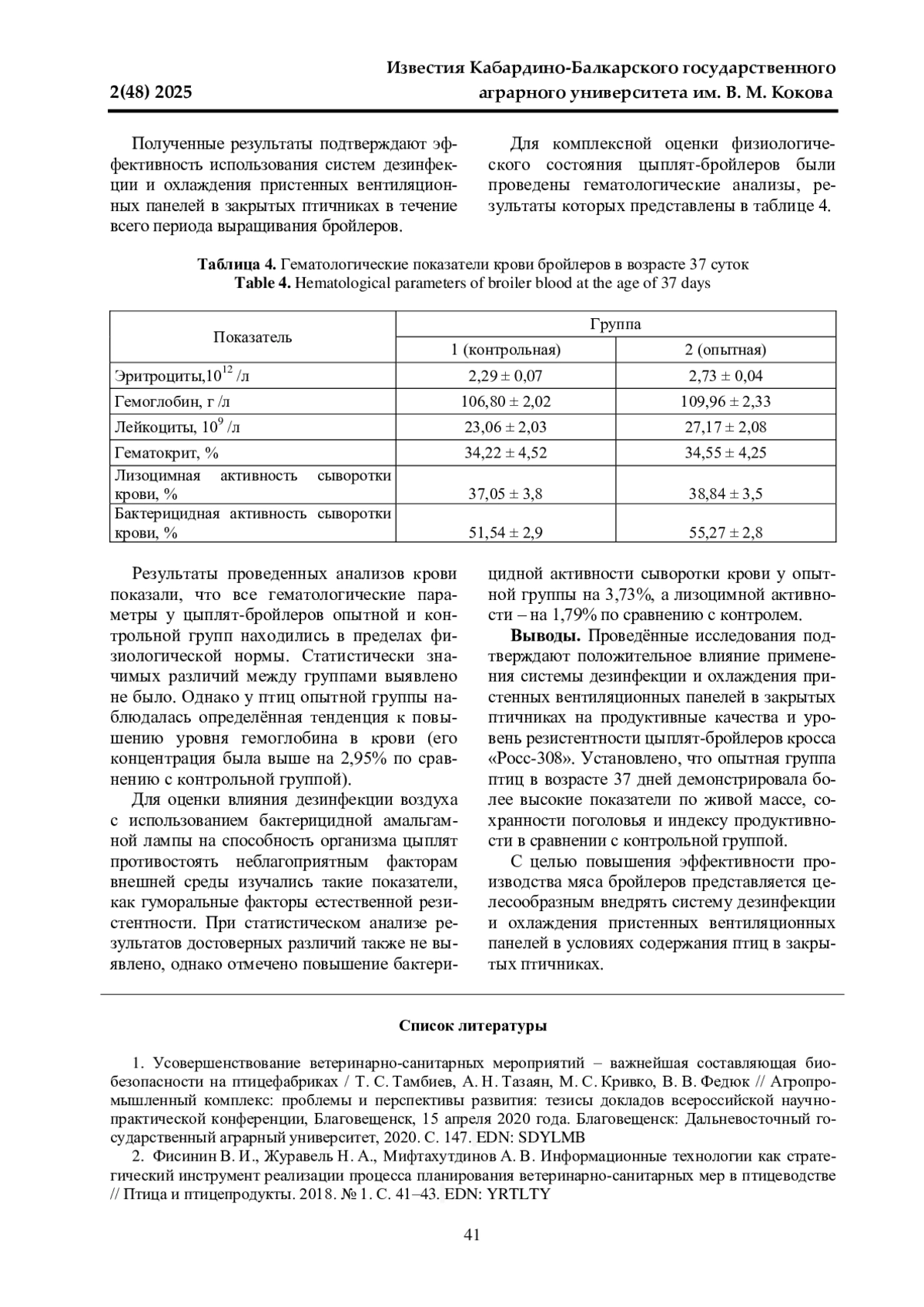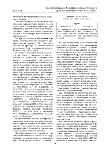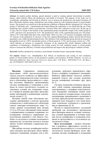 Статья: ВЛИЯНИЕ ДЕЗИНФЕКЦИИ И ОХЛАЖДЕНИЯ ПРИСТЕННЫХ ВЕНТИЛЯЦИОННЫХ ПАНЕЛЕЙ ЗАКРЫТЫХ ПТИЧНИКОВ НА ПРОДУКТИВНЫЕ КАЧЕСТВА И РЕЗИСТЕНТНОСТЬ ЦЫПЛЯТ-БРОЙЛЕРОВ (2025)
