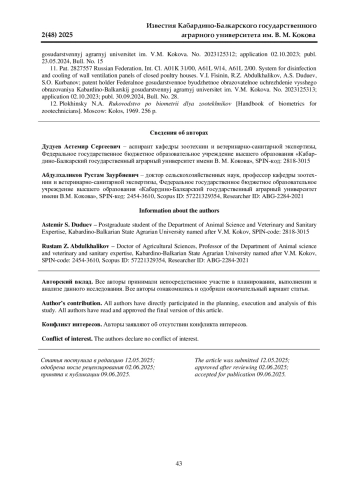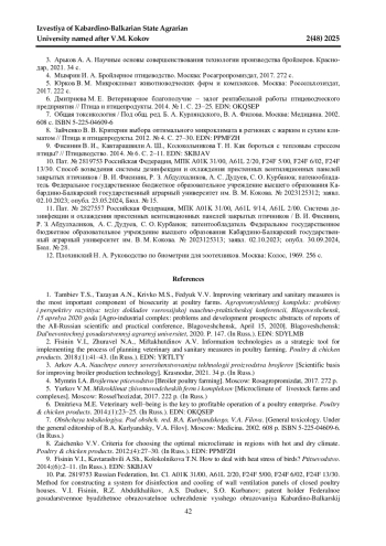 ДУДУЕВ А. С., АБДУЛХАЛИКОВ Р. З. ВЛИЯНИЕ ДЕЗИНФЕКЦИИ И ОХЛАЖДЕНИЯ ПРИСТЕННЫХ ВЕНТИЛЯЦИОННЫХ ПАНЕЛЕЙ ЗАКРЫТЫХ ПТИЧНИКОВ НА ПРОДУКТИВНЫЕ КАЧЕСТВА И РЕЗИСТЕНТНОСТЬ ЦЫПЛЯТ-БРОЙЛЕРОВ // ИЗВЕСТИЯ КАБАРДИНО-БАЛКАРСКОГО ГОСУДАРСТВЕННОГО АГРАРНОГО УНИВЕРСИТЕТА ИМ. В. М. КОКОВА. 2025. № 2 (48)