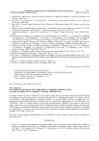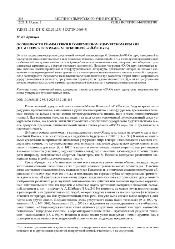 В статье рассматривается роман современной молодой писательницы М. Векшиной «Оӵ/Ӧч кар», написанный на удмуртском языке и выпущенный в свет отдельным книжным изданием в 2018 г., с точки зрения грамматических особенностей его художественного стиля (употребление подражательных слов, деепричастных оборотов, грамматическая вариативность в формах условного наклонения). Показано, что роман «Оӵ/Ӧч кар», являющийся ярким образцом постмодернистской и этнофутуристической литературы, представляет интерес не только с собственно литературоведческой точки зрения, но и с точки зрения лингвистического анализа, который и предпринят в данной работе. Результаты исследования могут быть полезны при разработке теории стилей современного удмуртского языка (в частности, при уточнении характеристик художественного стиля), а также при уточнении состава подражательных слов и рамок грамматической вариативности удмуртской письменной нормы.