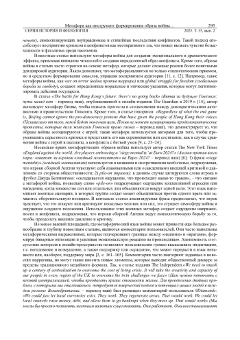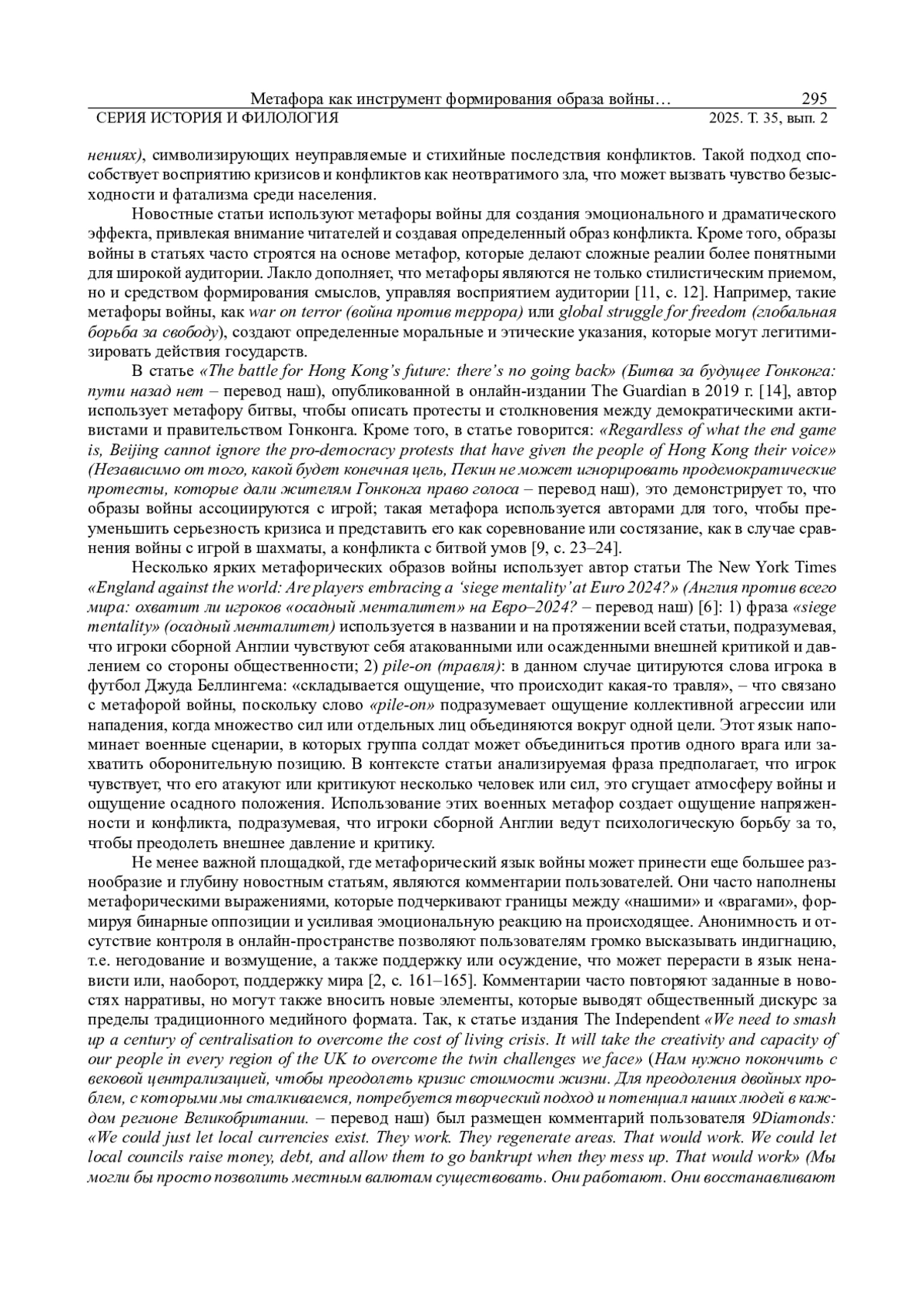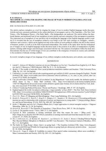 В статье исследуется метафора как инструмент формирования образа войны в современном англоязычном медийном дискурсе. Анализируются статьи и комментарии пользователей, опубликованные на онлайн-платформах таких газет, как «The Guardian», «The New York Times», «The Washington Times», «The Daily Mail», «The Independent». В статье определяются функциональные особенности и эмоциональная нагрузка метафор войны в новостных статьях и пользовательских комментариях рассматриваемых газет. Изучается контекстуальное использование метафор войны и их роль в обогащении языка англоязычных СМИ. Выявляется, что использование метафор, связанных с войной, выводит на первый план такие концепты, как «борьба», «атака», «защита» и «победа», которые могут применяться не только в контексте социально-политических конфликтов, но и в контексте бизнеса, политики, а также в сфере личных взаимоотношений. Результаты исследования показывают, что распространенное использоваие образов войны в англоязычном медийном дискурсе приводит к созданию эффекта манипуляции общественным мнением, в сознании читателей формируются устойчивые образы и стереотипы, связанные с войной. Анализ метафор в рамках исследования также демонстрирует, что использование вербальных образов войны может способствовать возникновению напряженности в обществе и эскалации уже существующих конфликтов.