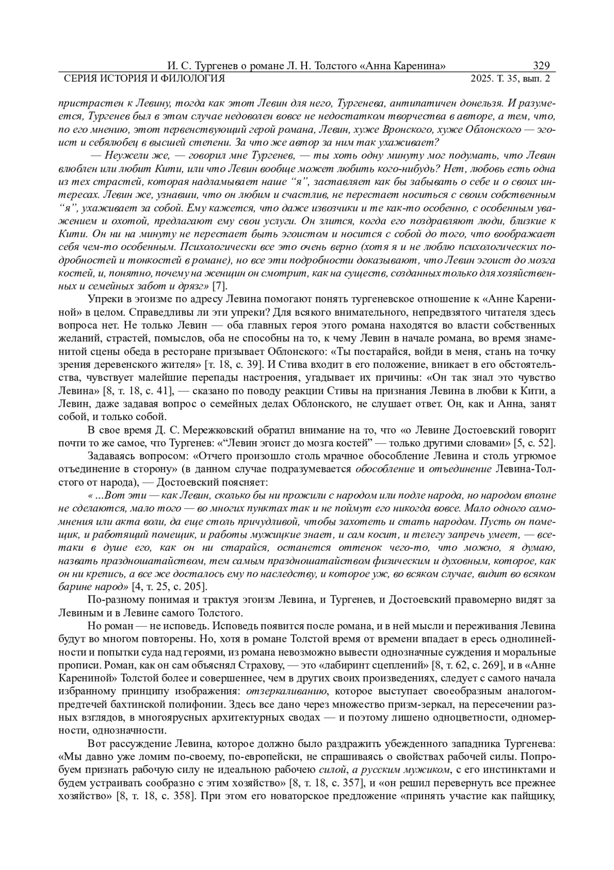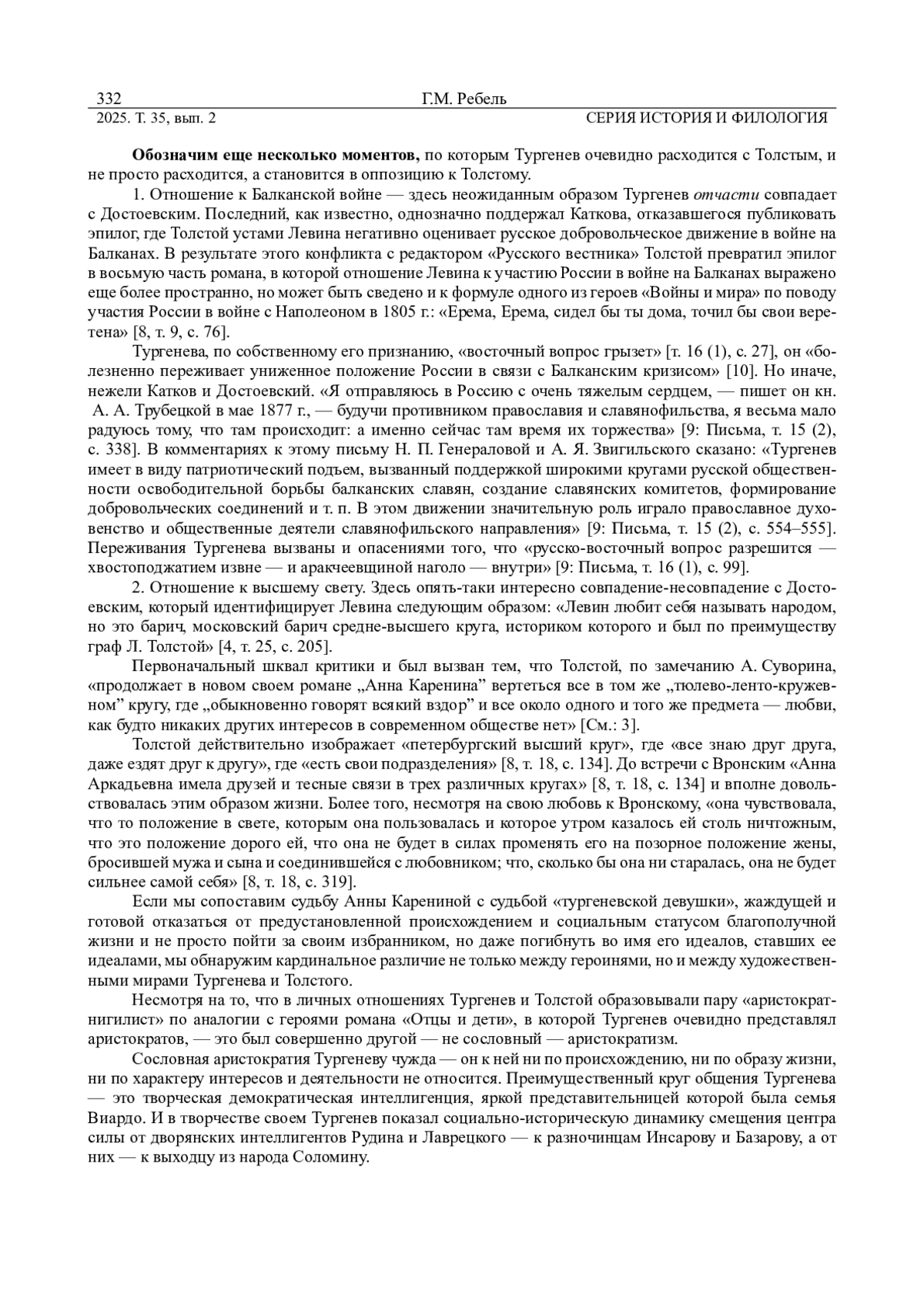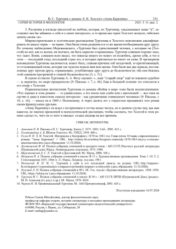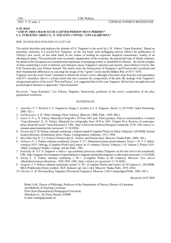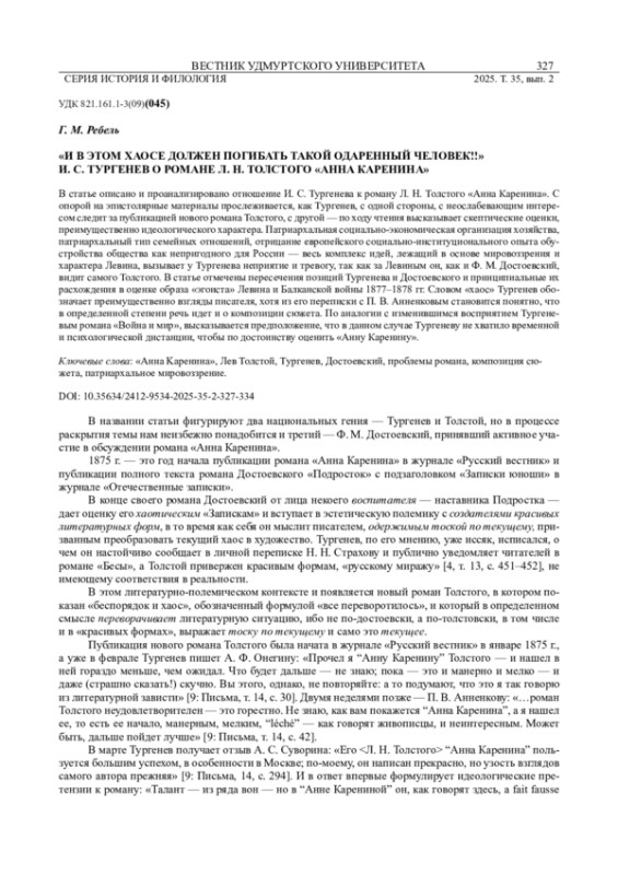 РЕБЕЛЬ Г. М. «И В ЭТОМ ХАОСЕ ДОЛЖЕН ПОГИБАТЬ ТАКОЙ ОДАРЕННЫЙ ЧЕЛОВЕК!!» И. С. ТУРГЕНЕВ О РОМАНЕ Л. Н. ТОЛСТОГО «АННА КАРЕНИНА» // ВЕСТНИК УДМУРТСКОГО УНИВЕРСИТЕТА. СЕРИЯ: ИСТОРИЯ И ФИЛОЛОГИЯ. 2025. Т. 35 № 2