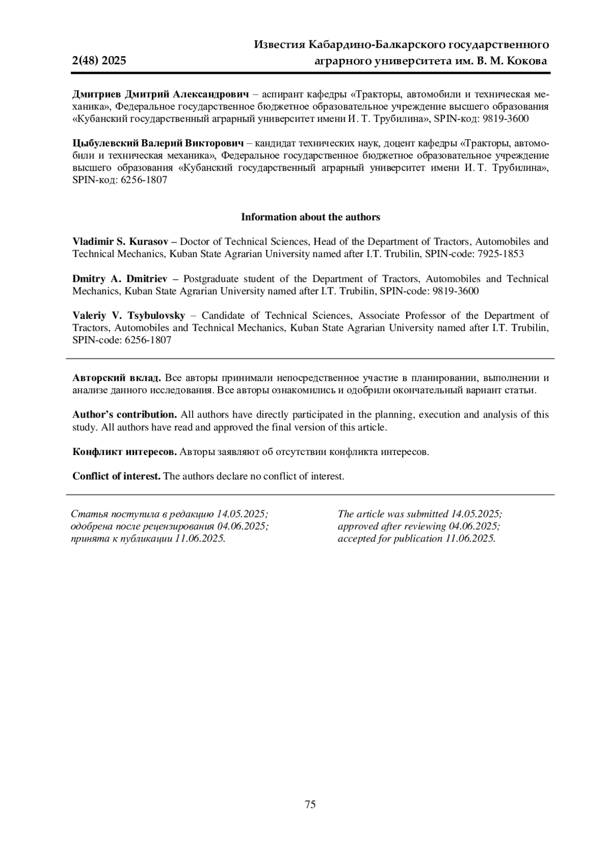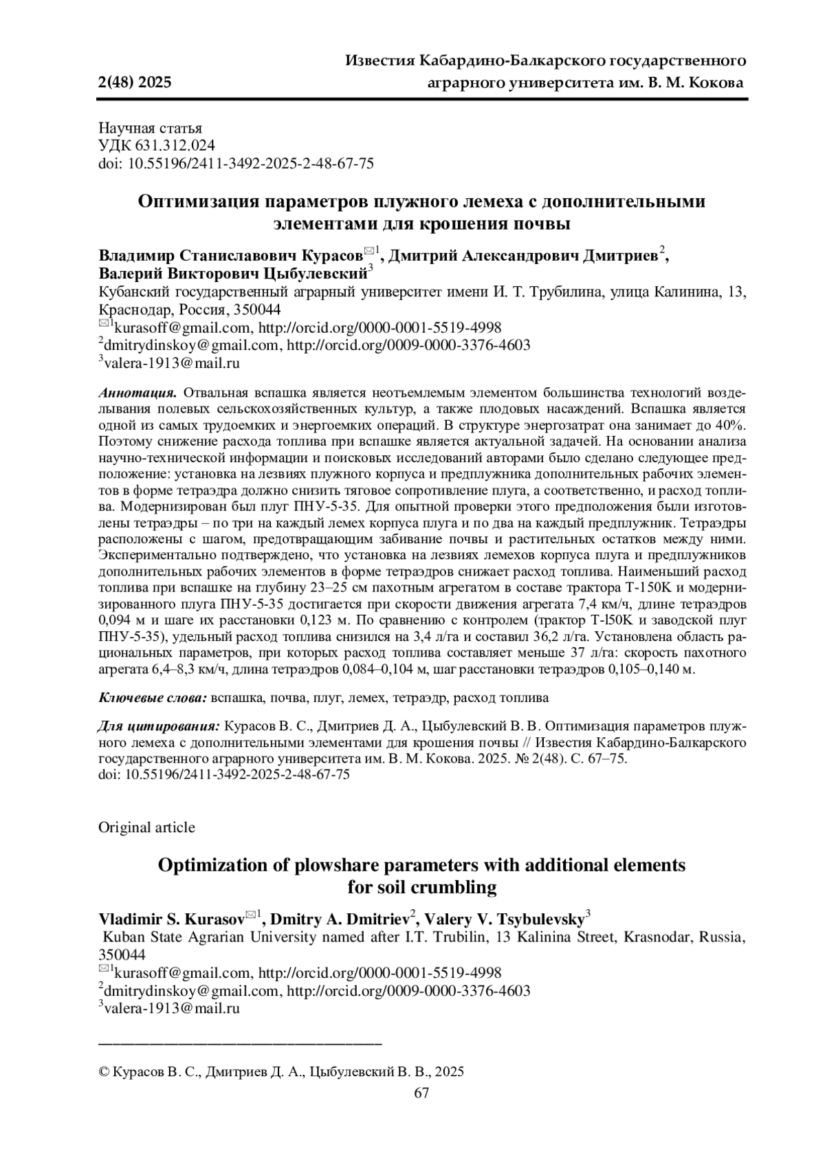 2. 	Дмитриев Д. А., Курасов В. С. Основные направления снижения расхода топлива и повышения качества рыхления почвы при отвальной вспашке // Вектор современной науки: сб. тез. по материалам Междунар. науч.-практ. конф. / отв. за вып. А. Г. Кощаев. Краснодар: КубГАУ, 2022. С. 804-805. EDN: PFVCFS