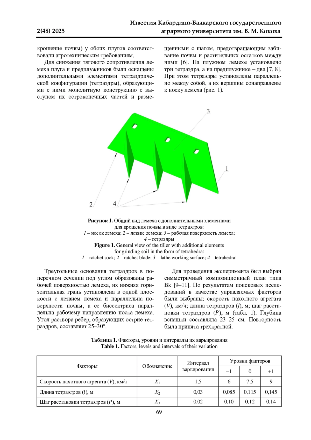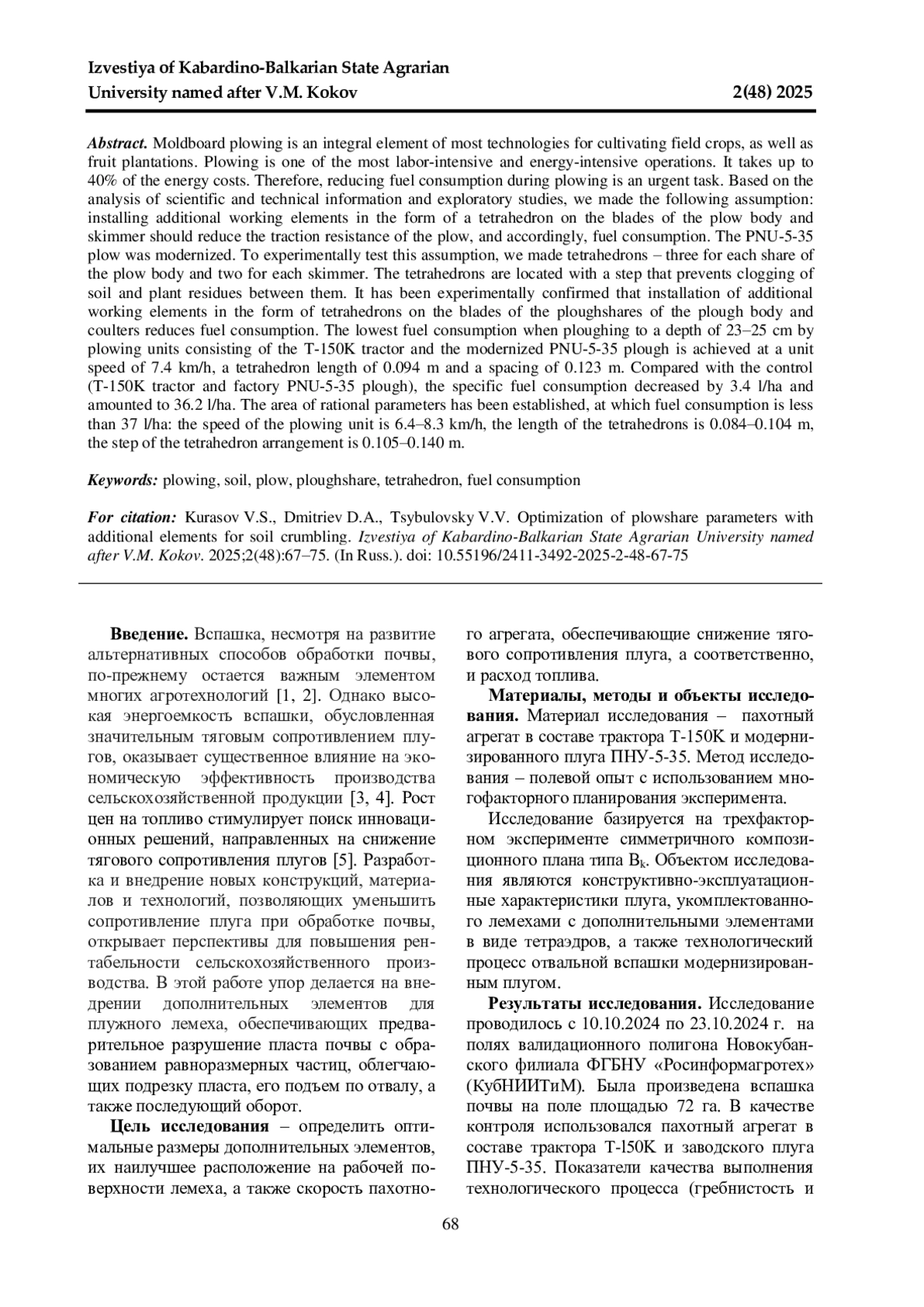 Отвальная вспашка является неотъемлемым элементом большинства технологий возделывания полевых сельскохозяйственных культур, а также плодовых насаждений. Вспашка является одной из самых трудоемких и энергоемких операций. В структуре энергозатрат она занимает до 40%. Поэтому снижение расхода топлива при вспашке является актуальной задачей. На основании анализа научно-технической информации и поисковых исследований авторами было сделано следующее предположение: установка на лезвиях плужного корпуса и предплужника дополнительных рабочих элементов в форме тетраэдра должно снизить тяговое сопротивление плуга, а соответственно, и расход топлива. Модернизирован был плуг ПНУ-5-35. Для опытной проверки этого предположения были изготовлены тетраэдры - по три на каждый лемех корпуса плуга и по два на каждый предплужник. Тетраэдры расположены с шагом, предотвращающим забивание почвы и растительных остатков между ними. Экспериментально подтверждено, что установка на лезвиях лемехов корпуса плуга и предплужников дополнительных рабочих элементов в форме тетраэдров снижает расход топлива. Наименьший расход топлива при вспашке на глубину 23-25 см пахотным агрегатом в составе трактора T-150K и модернизированного плуга ПНУ-5-35 достигается при скорости движения агрегата 7,4 км/ч, длине тетраэдров 0,094 м и шаге их расстановки 0,123 м. По сравнению с контролем (трактор T-l50K и заводской плуг ПНУ-5-35), удельный расход топлива снизился на 3,4 л/га и составил 36,2 л/га. Установлена область рациональных параметров, при которых расход топлива составляет меньше 37 л/га: скорость пахотного агрегата 6,4-8,3 км/ч, длина тетраэдров 0,084-0,104 м, шаг расстановки тетраэдров 0,105-0,140 м.