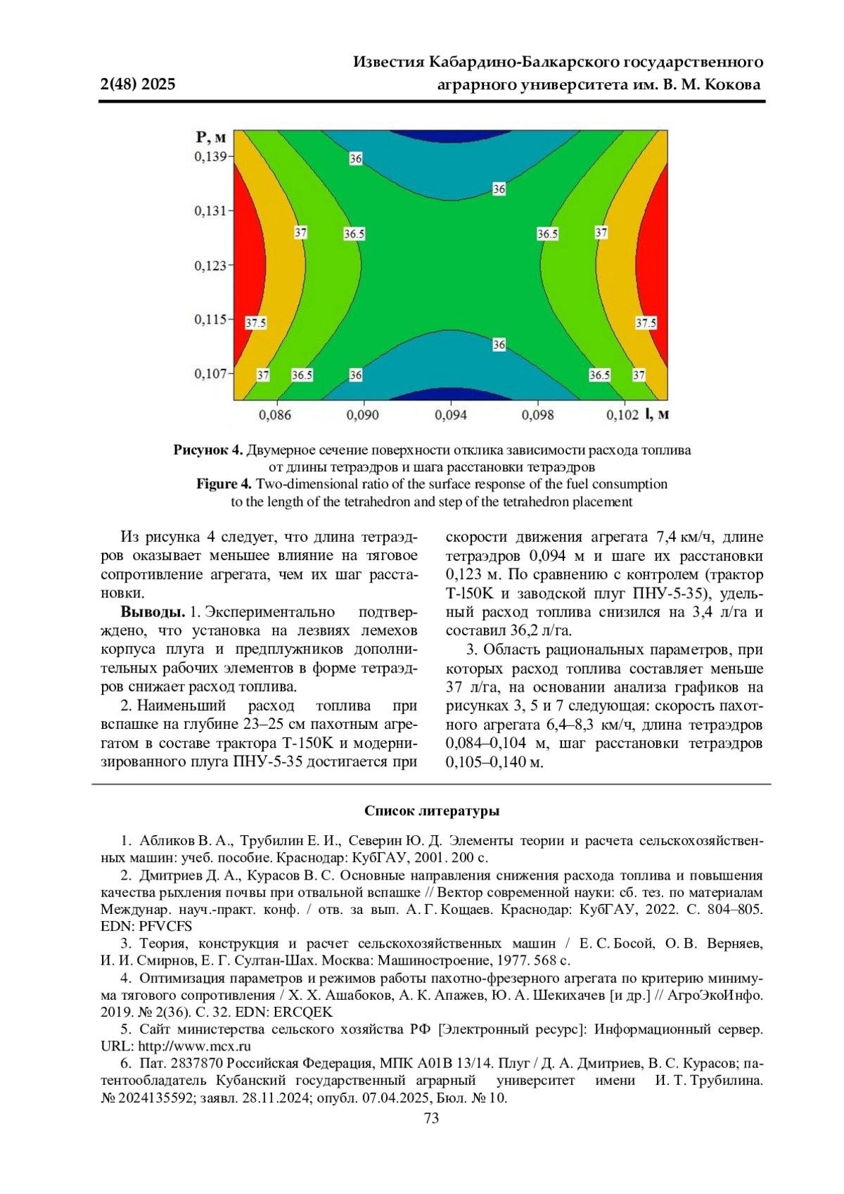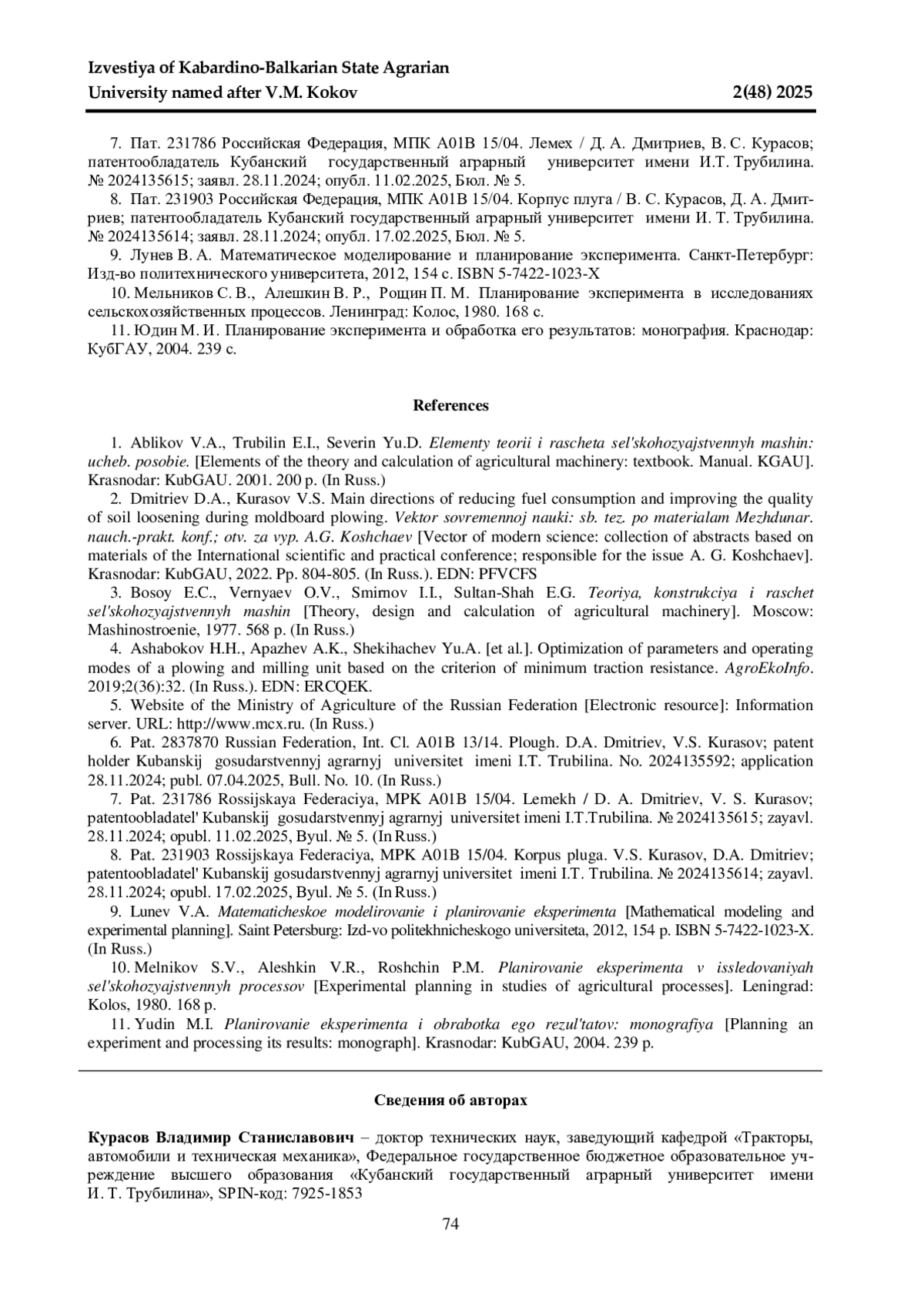 7. 	Пат. 231786 Российская Федерация, МПК A01B 15/04. Лемех / Д. А. Дмитриев, В. С. Курасов; патентообладатель Кубанский государственный аграрный университет имени И.Т. Трубилина. № 2024135615; заявл. 28.11.2024; опубл. 11.02.2025, Бюл. № 5.