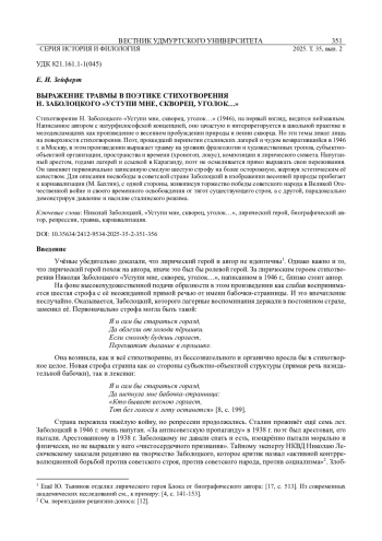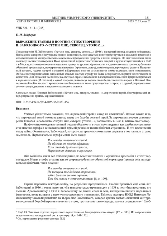 Стихотворение Н. Заболоцкого «Уступи мне, скворец, уголок…» (1946), на первый взгляд, видится пейзажным. Написанное автором с натурфилософской концепцией, оно зачастую и интерпретируется в школьной практике и мелодекламациях как произведение о весеннем пробуждении природы и пении скворца. Но эти темы лежат лишь на поверхности стихотворения. Поэт, прошедший перипетии сталинских лагерей и чудом возвратившийся в 1946 г. в Москву, в этом произведении выражает травму на уровнях фразеологии и художественных тропов, субъектно-объектной организации, пространства и времени (хронотоп, локус), композиции и лирического сюжета. Напуганный арестом, годами лагерей и ссылкой в Караганду, поэт не осмеливается прямо выражать свои переживания. Он заменяет первоначально записанную смелую шестую строфу на более осторожную, жертвуя эстетическим её качеством. Для описания несвободы в советской стране Заболоцкий в изображении весенней природы прибегает к карнавализации (М. Бахтин), с одной стороны, живописуя торжество победы советского народа в Великой Отечественной войне и своего временного освобождения от тягот существующего строя, а с другой, парадоксально демонстрируя давление и насилие сталинского режима.