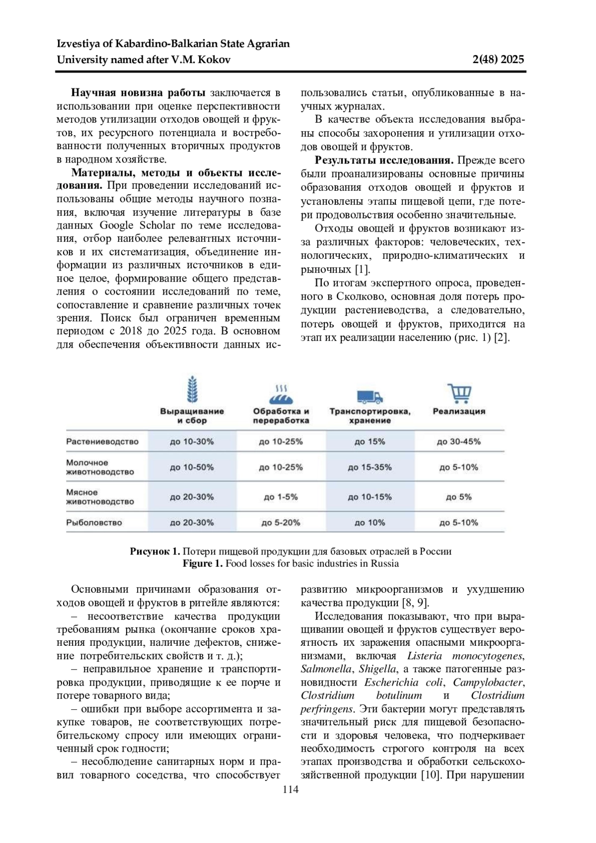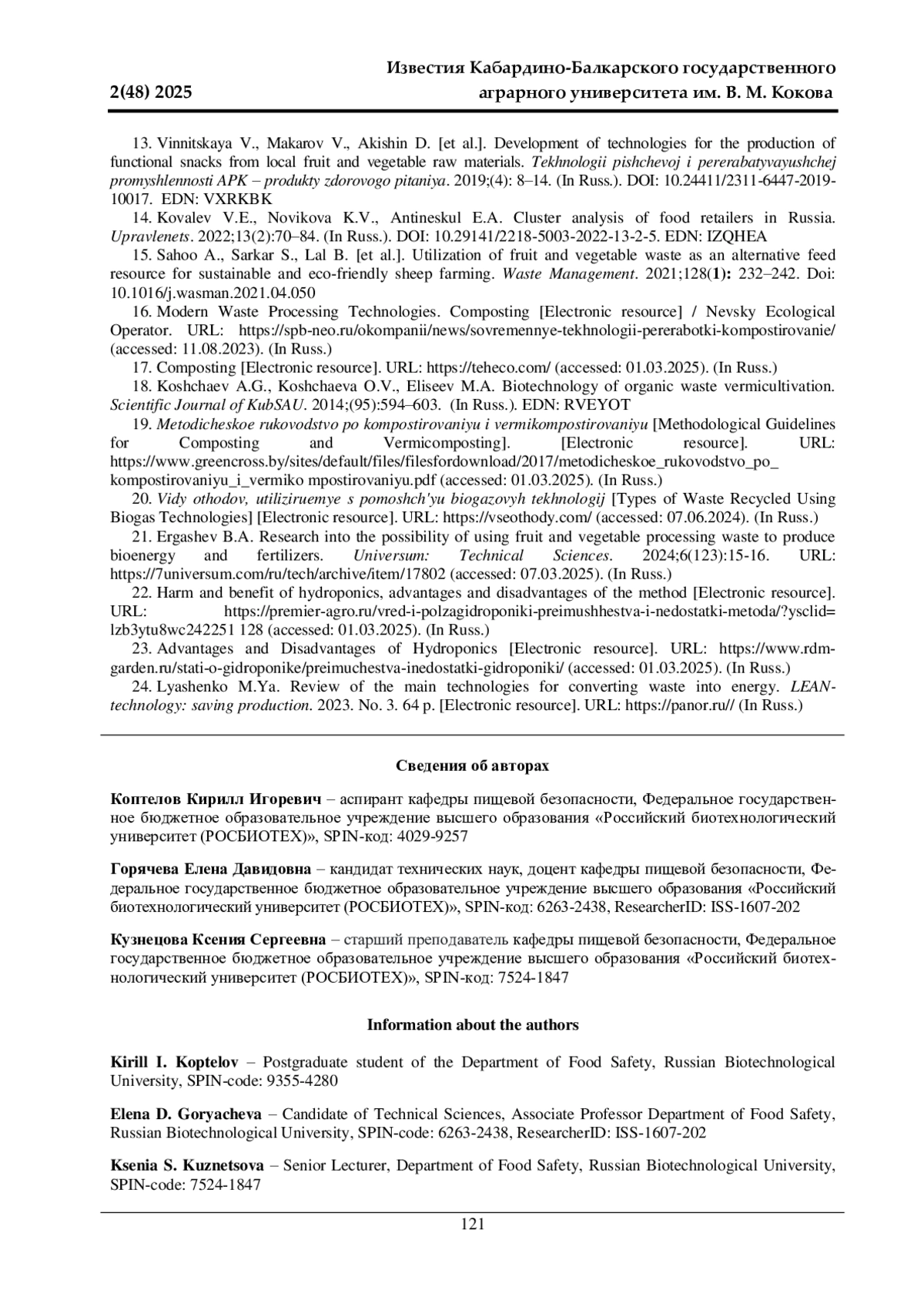 КОПТЕЛОВ К. И., ГОРЯЧЕВА Е. Д., КУЗНЕЦОВА К. С. ПРОБЛЕМЫ И ПЕРСПЕКТИВЫ ТЕХНОЛОГИЙ УТИЛИЗАЦИИ ОТХОДОВ ОВОЩЕЙ И ФРУКТОВ // ИЗВЕСТИЯ КАБАРДИНО-БАЛКАРСКОГО ГОСУДАРСТВЕННОГО АГРАРНОГО УНИВЕРСИТЕТА ИМ. В. М. КОКОВА. 2025. № 2 (48)
