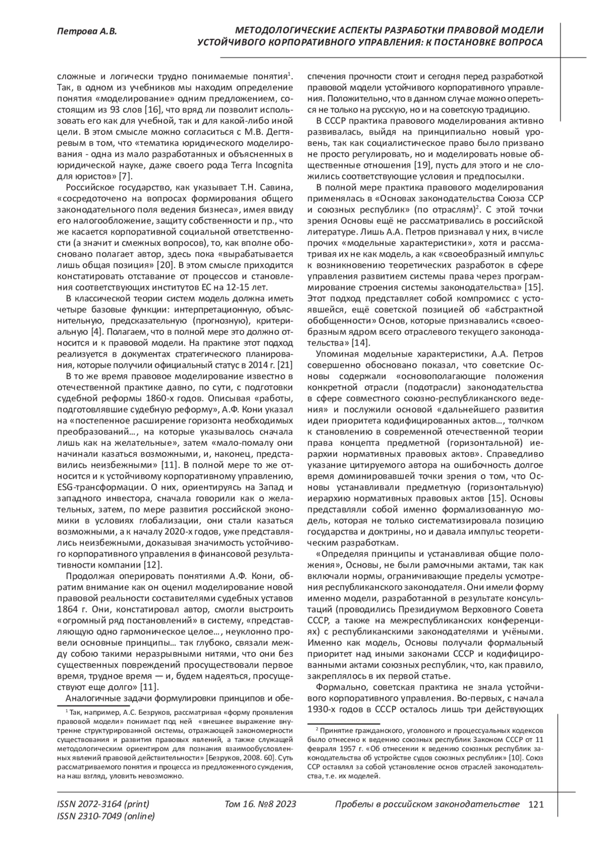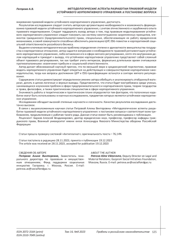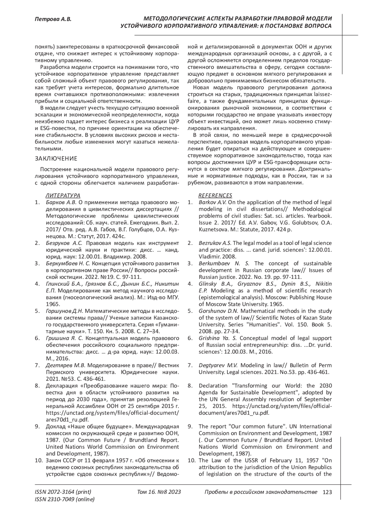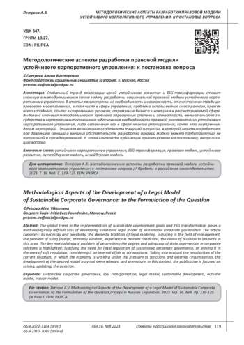 ПЕТРОВА А. В. МЕТОДОЛОГИЧЕСКИЕ АСПЕКТЫ РАЗРАБОТКИ ПРАВОВОЙ МОДЕЛИ УСТОЙЧИВОГО КОРПОРАТИВНОГО УПРАВЛЕНИЯ: К ПОСТАНОВКЕ ВОПРОСА // ПРОБЕЛЫ В РОССИЙСКОМ ЗАКОНОДАТЕЛЬСТВЕ. 2023. Т. 16 № 8 (36 СТ.)