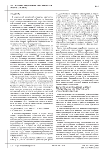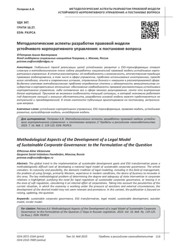 Статья: МЕТОДОЛОГИЧЕСКИЕ АСПЕКТЫ РАЗРАБОТКИ ПРАВОВОЙ МОДЕЛИ УСТОЙЧИВОГО КОРПОРАТИВНОГО УПРАВЛЕНИЯ: К ПОСТАНОВКЕ ВОПРОСА (2023)
