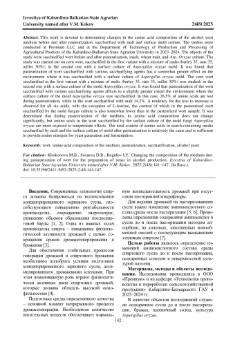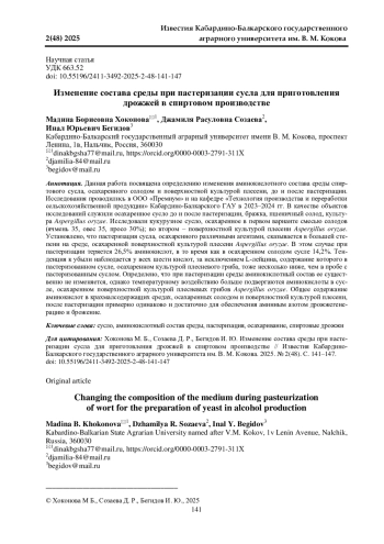 Данная работа посвящена определению изменения аминокислотного состава среды спиртового сусла, осахаренного солодом и поверхностной культурой плесени, до и после пастеризации. Исследования проводились в ООО «Премиум» и на кафедре «Технология производства и переработки сельскохозяйственной продукции» Кабардино-Балкарского ГАУ в 2023-2024 гг. В качестве объектов исследований служили осахаренное сусло до и после пастеризации, бражка, пшеничный солод, культура Aspergillus oryzae. Исследовали кукурузное сусло, осахаренное в первом варианте смесью солодов (ячмень 35, овес 35, просо 30%); во втором - поверхностной культурой плесени Aspergillus oryzae. Установлено, что пастеризация сусла, осахаренного различными агентами, сказывается в большей степени на среде, осахаренной поверхностной культурой плесени Aspergillus oryzae. В этом случае при пастеризации теряется 26,5% аминокислот, в то время как в осахаренном солодом сусле 14,2%. Тенденция к убыли наблюдается у всех шести кислот, за исключением L-лейцина, содержание которого в пастеризованном сусле, осахаренном культурой плесневого гриба, тоже несколько ниже, чем в пробе с пастеризованным суслом. Определено, что при пастеризации среды аминокислотный состав ее существенно не изменяется, однако температурному воздействию больше подвергаются аминокислоты в сусле, осахаренном поверхностной культурой плесневых грибов Aspergillus oryzae. Общее содержание аминокислот в крахмалсодержащих средах, осахаренных солодом и поверхностной культурой плесени, после пастеризации примерно одинаково и достаточно для обеспечения аминным азотом дрожжегенерацию и брожение.