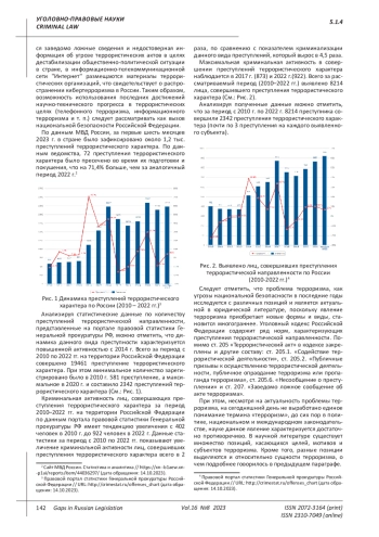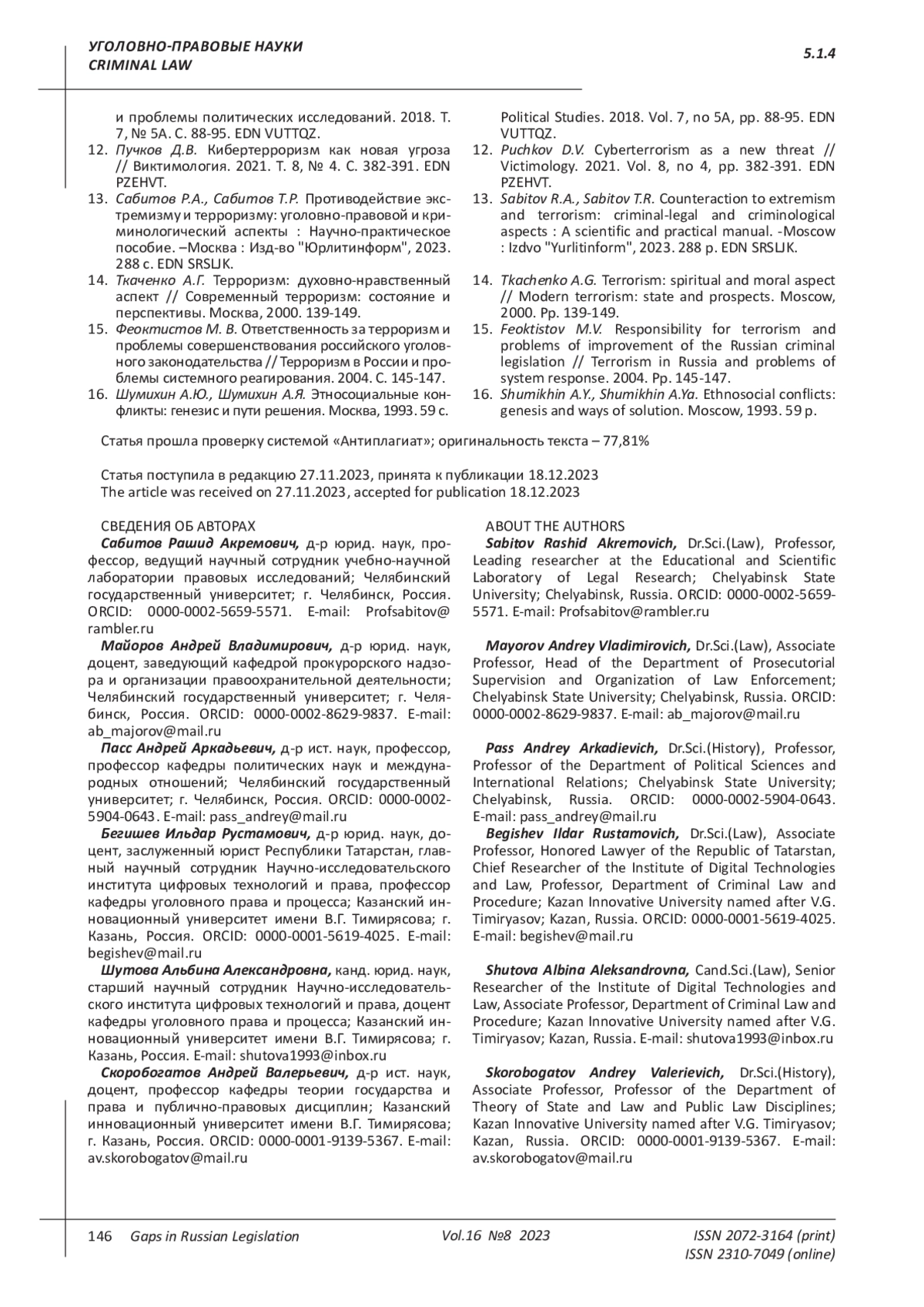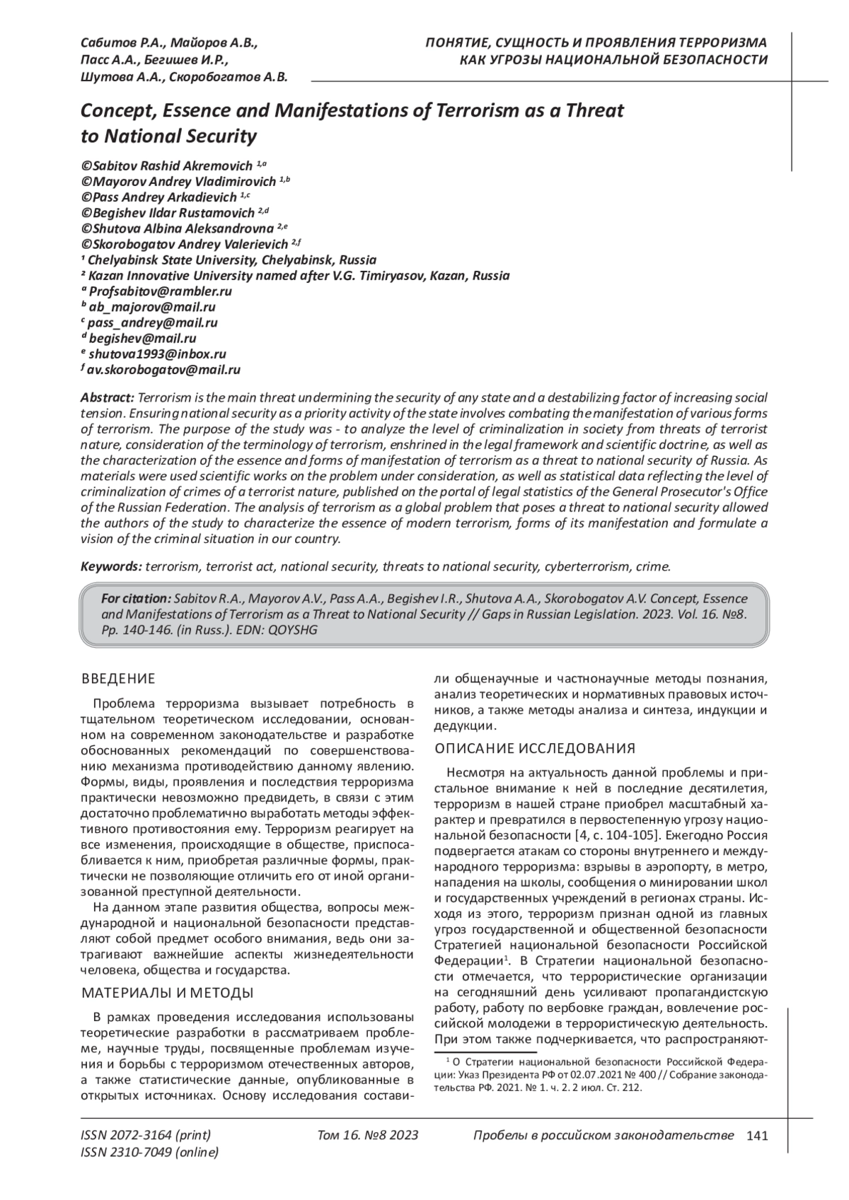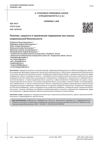 САБИТОВ Р. А., МАЙОРОВ А. В., ПАСС А. А., БЕГИШЕВ И. Р., ШУТОВА А. А., СКОРОБОГАТОВ А. В. ПОНЯТИЕ, СУЩНОСТЬ И ПРОЯВЛЕНИЯ ТЕРРОРИЗМА КАК УГРОЗЫ НАЦИОНАЛЬНОЙ БЕЗОПАСНОСТИ // ПРОБЕЛЫ В РОССИЙСКОМ ЗАКОНОДАТЕЛЬСТВЕ. 2023. Т. 16 № 8 (36 СТ.)