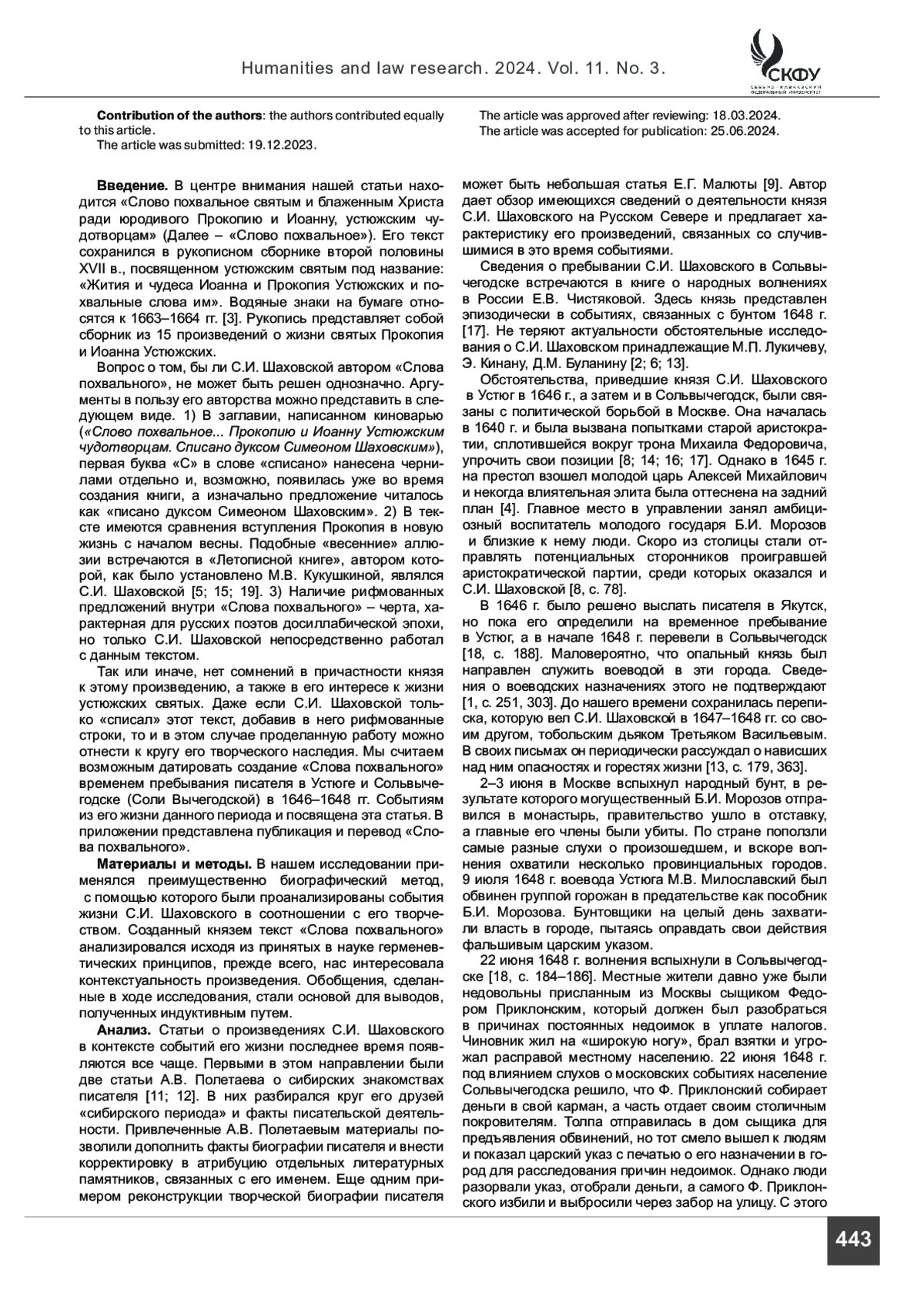 Введение. Статья посвящена эпизоду из жизни выдающегося писателя, поэта, богослова первой половины XVII в. князя Семена Ивановича Шаховского. В центре внимания авторов находится время его пребывания в Сольвычегодске в 1647–1648 гг., а также созданное им в это время похвальное слово устюжским святым Прокопию и Иоанну.