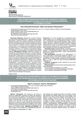 Введение. Обращение к истории становления самостоятельной Кавказской и Черноморской епархии обусловлено изучением вопроса проблемы инкорпорации Северного Кавказа в состав Российской империи. В условиях отсутствия разветвленной системы органов административного контроля и затяжного военного конфликта в первой половине XIX в., шел процесс поиска платформы национальной идентичности, что позволяло не только снизить уровень эскалации конфликта, но и провести инкорпорацию Северного Кавказа в социокультурное пространство Российской империи.
