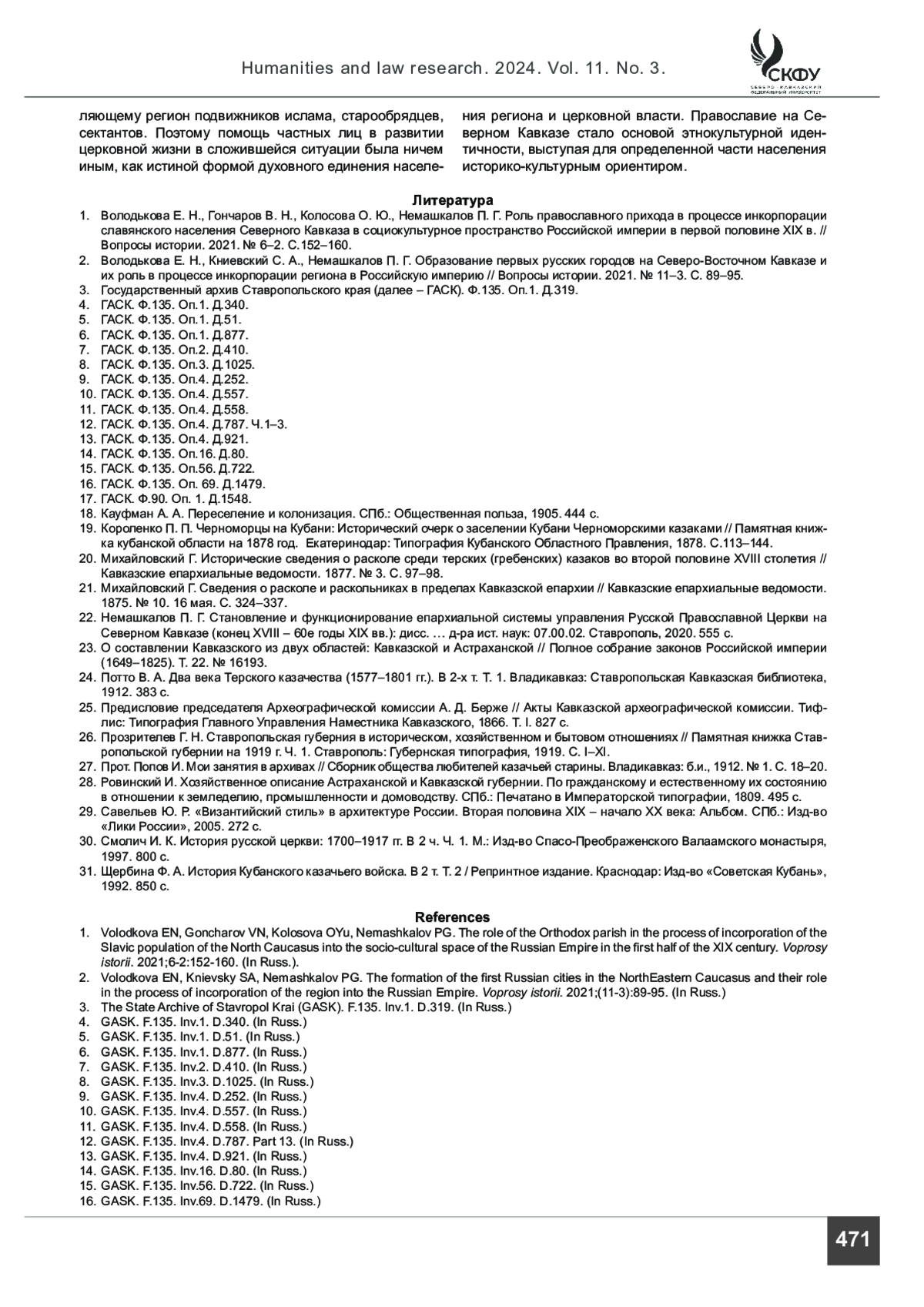 1. Володькова Е. Н., Гончаров В. Н., Колосова О. Ю., Немашкалов П. Г. Роль православного прихода в процессе инкорпорации славянского населения Северного Кавказа в социокультурное пространство Российской империи в первой половине XIX в. // Вопросы истории. 2021. № 6-2. С.152-160.