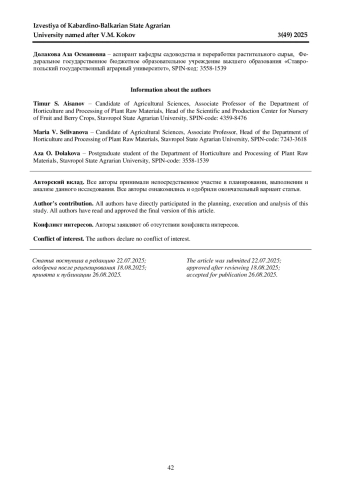 АЙСАНОВ Т. С., СЕЛИВАНОВА М. В., ДОЛАКОВА А. О. ВЛИЯНИЕ МИКРОУДОБРЕНИЙ НА ПРОДУКТИВНОСТЬ СОРТОВ ГРУШИ В ЮЖНОЙ ЗОНЕ РОССИИ // ИЗВЕСТИЯ КАБАРДИНО-БАЛКАРСКОГО ГОСУДАРСТВЕННОГО АГРАРНОГО УНИВЕРСИТЕТА ИМ. В. М. КОКОВА. 2025. № 3 (49)