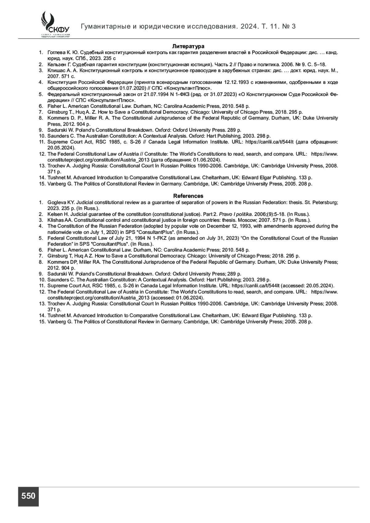 1. Гоглева К. Ю. Судебный конституционный контроль как гарантия разделения властей в Российской Федерации: дис. … канд. юрид. наук. СПб., 2023. 235 с
