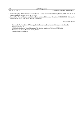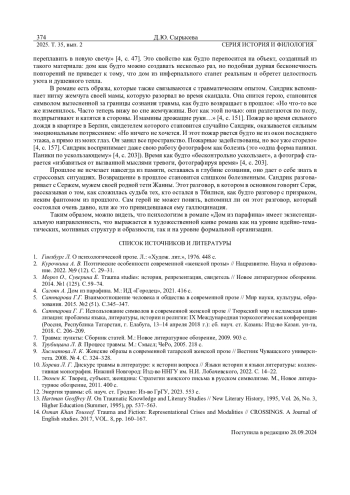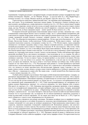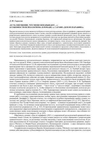 СЫРЫСЕВА Д. Ю. «ЕСТЬ ОЩУЩЕНИЕ, ЧТО МЕНЯ ОБМАНЫВАЮТ...»: ОСОБЕННОСТИ ПСИХОЛОГИЗМА В РОМАНЕ А. САГОЯН «ДОМ ИЗ ПАРАФИНА» // ВЕСТНИК УДМУРТСКОГО УНИВЕРСИТЕТА. СЕРИЯ: ИСТОРИЯ И ФИЛОЛОГИЯ. 2025. Т. 35 № 2