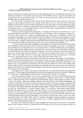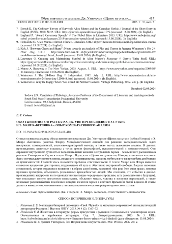 СЕДОВА Е. С. ОБРАЗ ЖИВОТНОГО В РАССКАЗАХ ДЖ. УИНТЕРСОН «ЩЕНОК НА СУТКИ» И Э. МАНРО «БЕГЛЯНКА»: ОПЫТ КОМПАРАТИВНОГО АНАЛИЗА // ВЕСТНИК УДМУРТСКОГО УНИВЕРСИТЕТА. СЕРИЯ: ИСТОРИЯ И ФИЛОЛОГИЯ. 2025. Т. 35 № 2