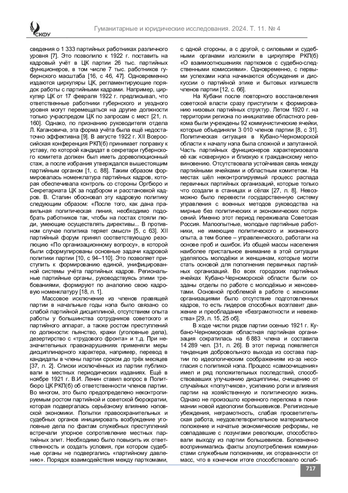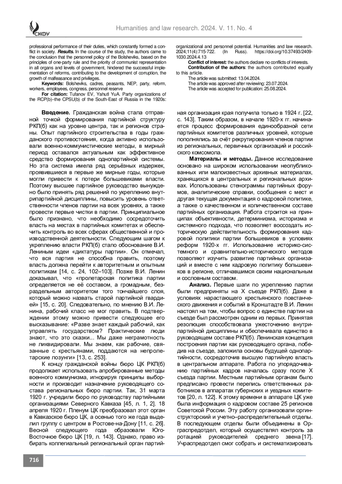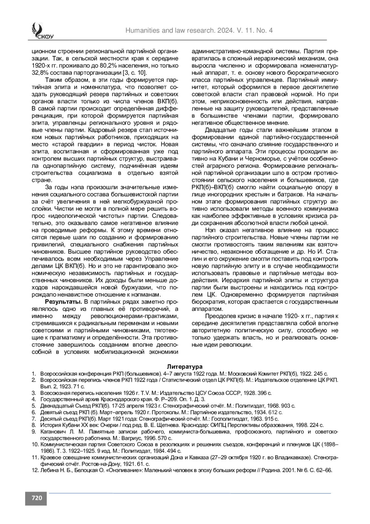 Введение. Актуальность рассматриваемой темы обусловлена тем, что опыт подготовки, обучения, формирования кадрового потенциала власти в условиях реформ 1920-х гг. востребован современной Россией. Он позволяет, обратившись к историческому опыту, определить основные приоритетные направления в подготовке управленцев способных работать и принимать решения в условиях ограниченных ресурсов. Целью статья является анализ состоянии партийных организаций регионов Северного Кавказа, которые в 1920-х гг. были единственными источниками формирования кадрового потенциала Советской власти. От их качественно состава, а именно от уровня грамотности, управленческого опыта зависел успех реформ.