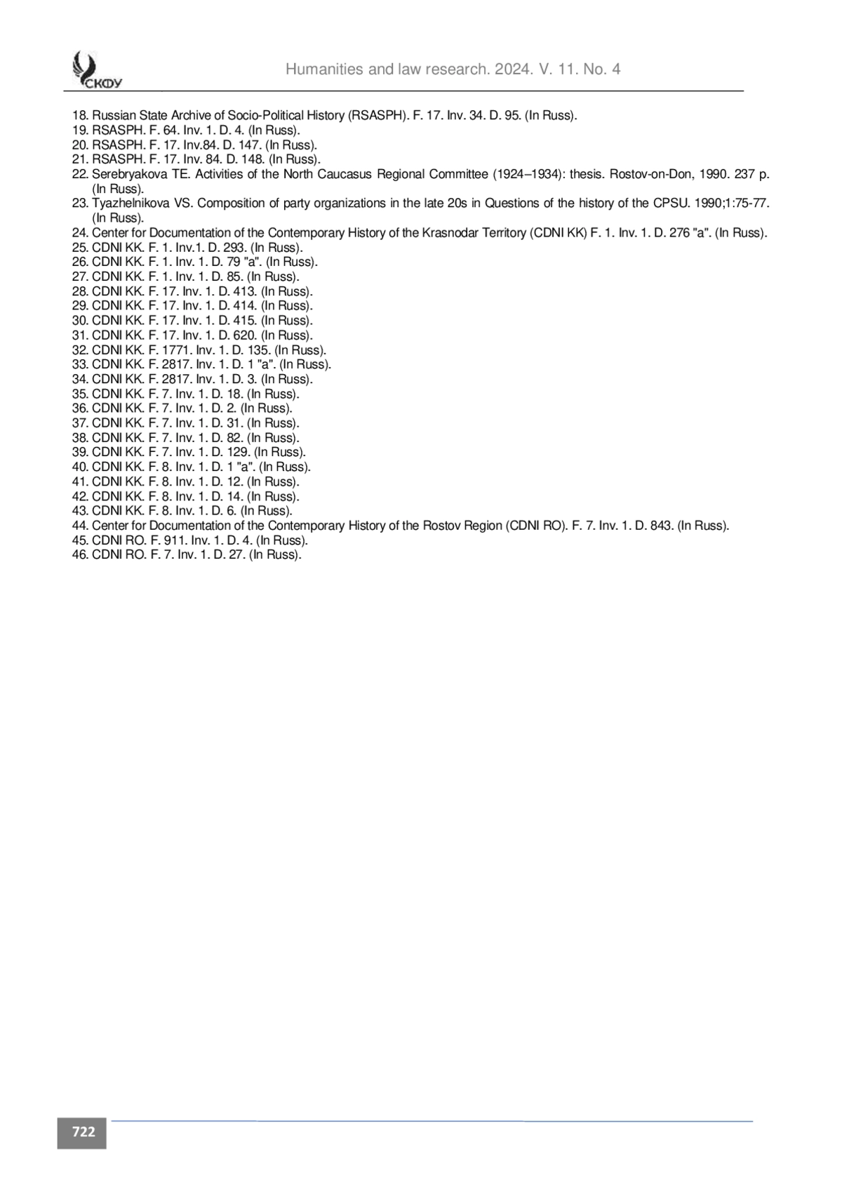 22. Серебрякова Т. Е. Деятельность Северо-Кавказского крайкома (1924-1934 гг.): дис. ... канд. ист. наук. Ростов-на-Дону, 1990. 237 с.