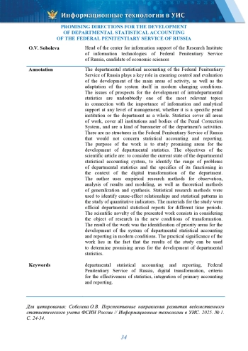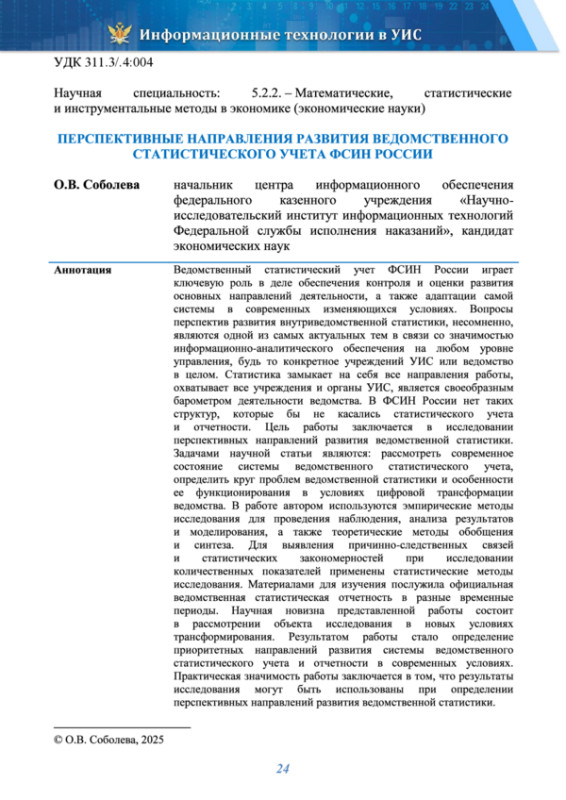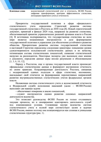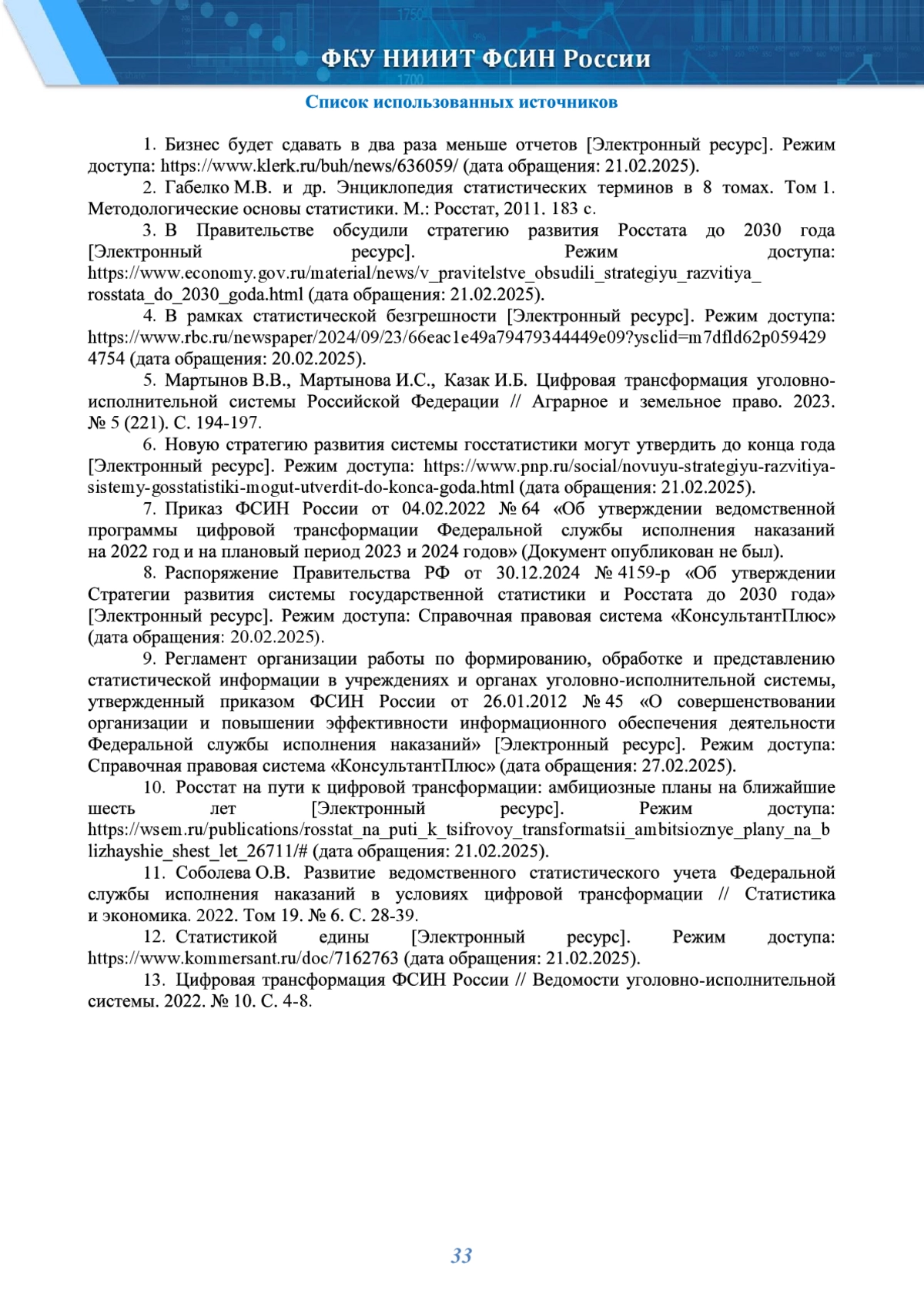 11. Соболева О.В. Развитие ведомственного статистического учета Федеральной службы исполнения наказаний в условиях цифровой трансформации // Статистика и экономика. 2022. Том 19. № 6. С. 28-39. EDN: UKROZQ