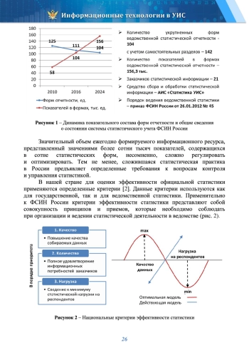 Приоритеты государственной политики в сфере официального статистического учета определены Стратегией развития государственной статистики и Росстата до 2030 года [8]. Новый стратегический документ, принятый в финале 2024 года, направлен на развитие статистики, обеспечивающей принятие управленческих решений органами власти в России [4]. В источниках подчеркивается, что государственная статистика во всем Мире является незаменимым инструментом В деле формирования государственной политики и управления для обеспечения устойчивого развития общества. Приоритетами развития системы государственной статистики в настоящей Стратегии определены следующие ориентиры: повышение уровня удовлетворенности пользователей статистических данных и их качества, оптимизация состава статистических показателей, снижение статистической нагрузки на респондентов. Некоторые эксперты уже высказали свое мнение о документе, определив данные меры вполне разумными и обоснованными [1, 3, 6, 10, 12].
