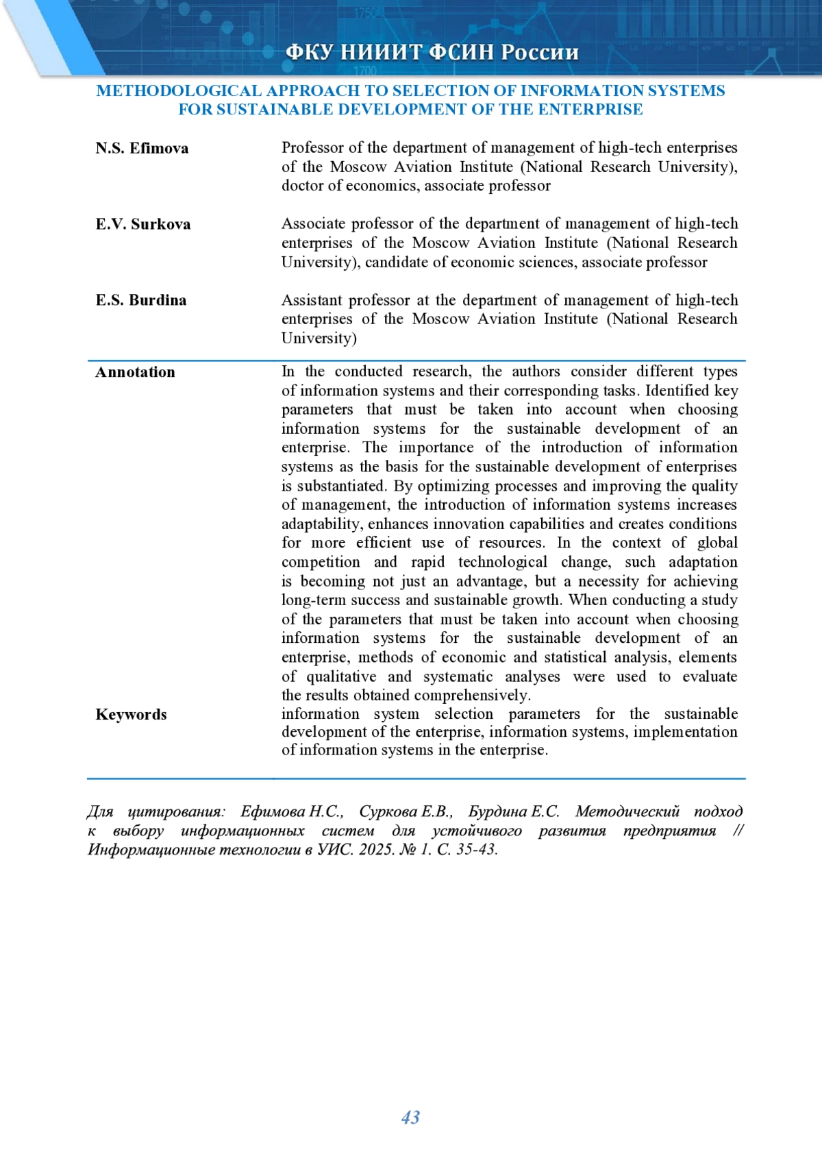 1. Automation of production processes: problems and solutions / Maksimova M.V., Efimova N.S., Kucheva N.A., Surkova E.V // Russian Engineering Research. 2023. Т. 43. № 12. С. 1602-1605. EDN: CRVBKF