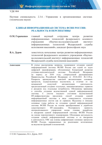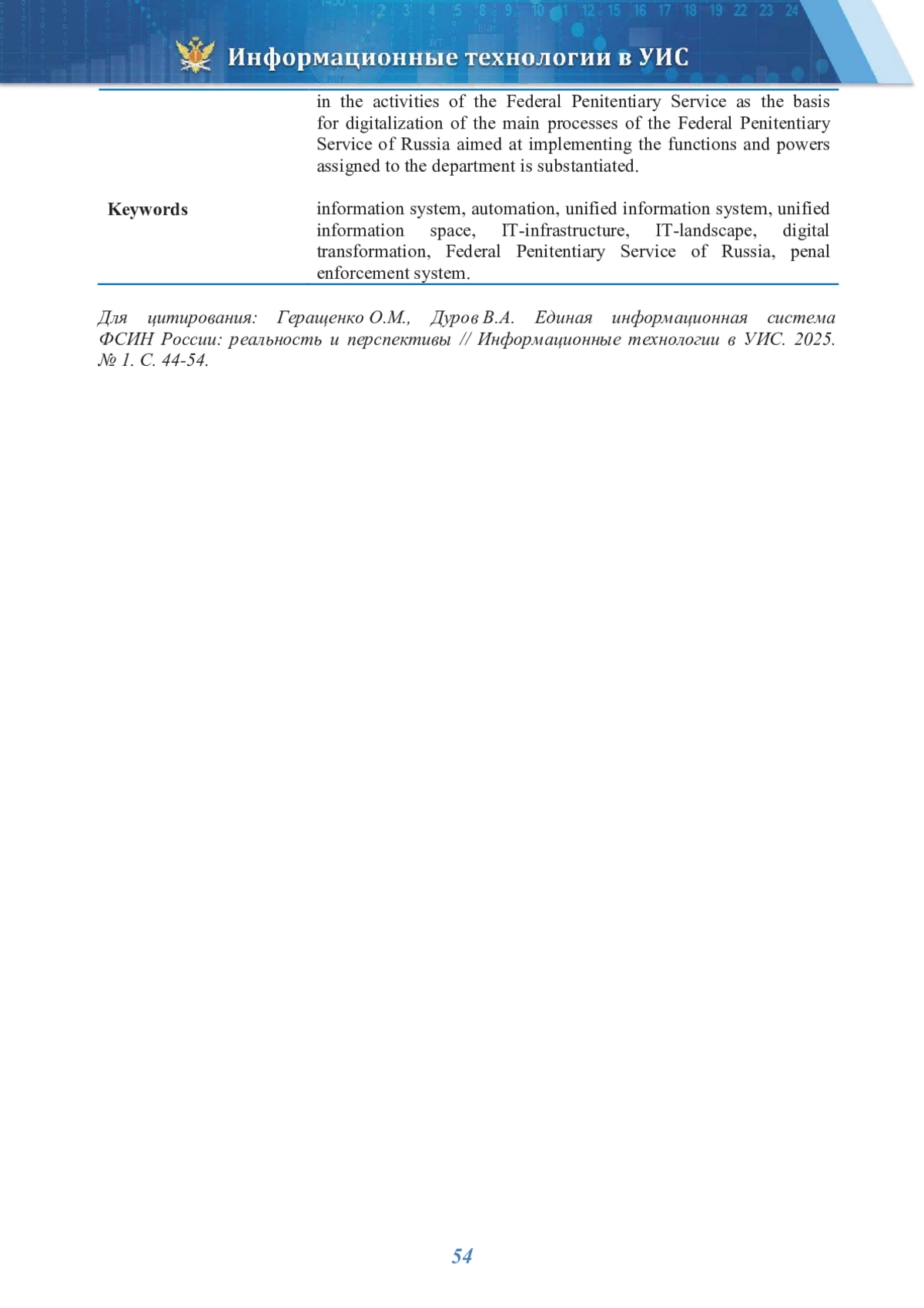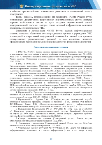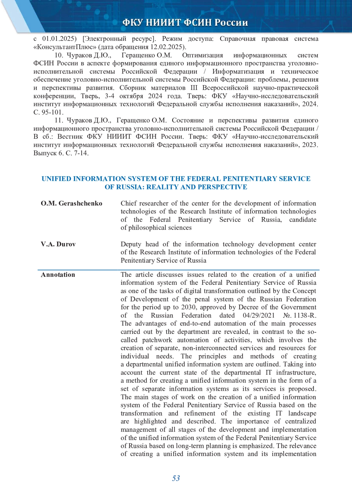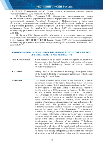11. Чураков Д.Ю., Геращенко О.М. Состояние и перспективы развития единого информационного пространства уголовно-исполнительной системы Российской Федерации / В сб.: Вестник ФКУ НИИИТ ФСИН России. Тверь: ФКУ “Научно-исследовательский институт информационных технологий Федеральной службы исполнения наказаний”, 2023. Выпуск 6. С. 7-14. EDN: ATIFQI