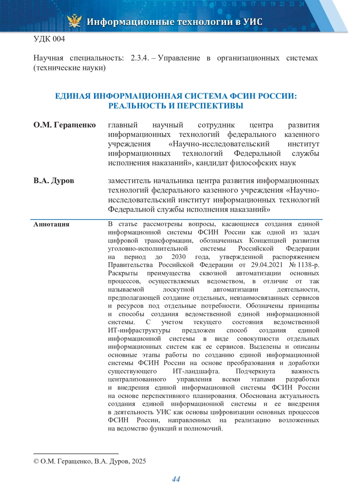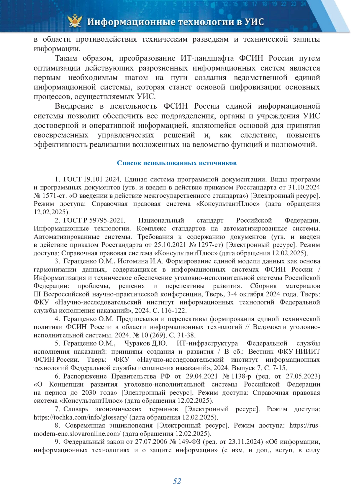 4. Геращенко О.М. Предпосылки и перспективы формирования единой технической политики ФСИН России в области информационных технологий // Ведомости уголовно-исполнительной системы. 2024. № 10 (269). С. 31-38. EDN: DEPYJO