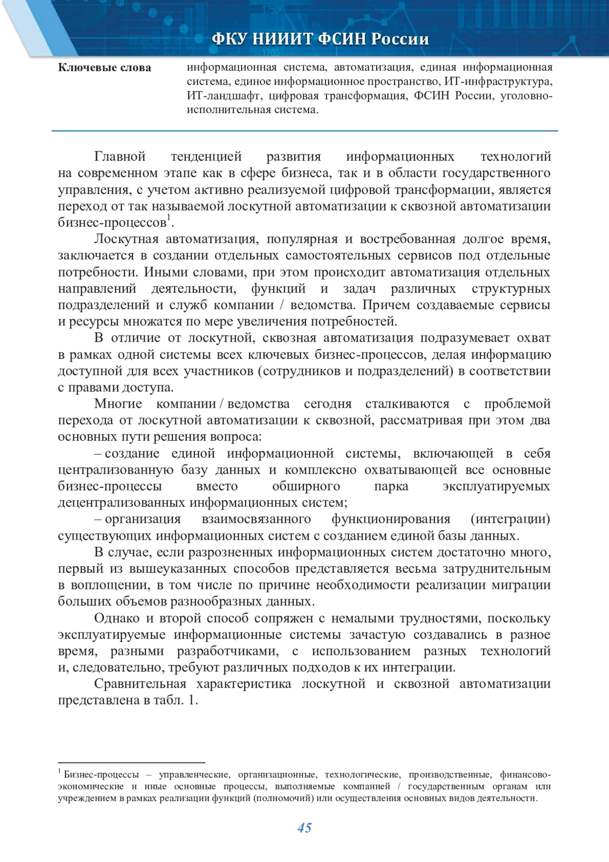 В статье рассмотрены вопросы, касающиеся создания единой информационной системы ФСИН России как одной из задач цифровой трансформации, обозначенных Концепцией развития уголовно-исполнительной системы Российской Федерации на период до 2030 года, утвержденной распоряжением Правительства Российской Федерации от 29.04.2021 No 1138-р. Раскрыты преимущества сквозной автоматизации основных процессов, осуществляемых ведомством, в отличие от так называемой лоскутной автоматизации деятельности, предполагающей создание отдельных, невзаимосвязанных сервисов и ресурсов под отдельные потребности. Обозначены принципы и способы создания ведомственной единой информационной системы. С учетом текущего состояния ведомственной ИТ-инфраструктуры предложен способ создания единой информационной системы в виде совокупности отдельных информационных систем как ее сервисов. Выделены и описаны основные этапы работы по созданию единой информационной системы ФСИН России на основе преобразования и доработки существующего ИТ-ландшафта. Подчеркнута важность централизованного управления всеми этапами разработки и внедрения единой информационной системы ФСИН России на основе перспективного планирования. Обоснована актуальность создания единой информационной системы и ее внедрения в деятельность УИС как основы цифровизации основных процессов ФСИН России, направленных на реализацию возложенных на ведомство функций и полномочий.