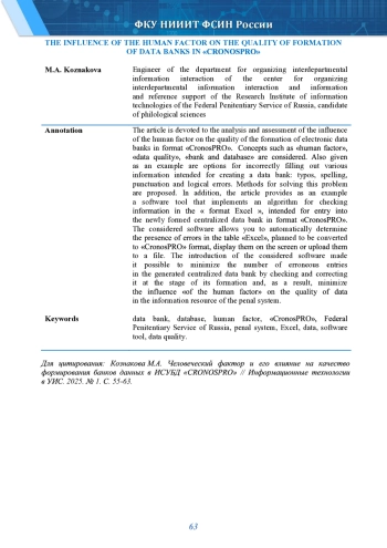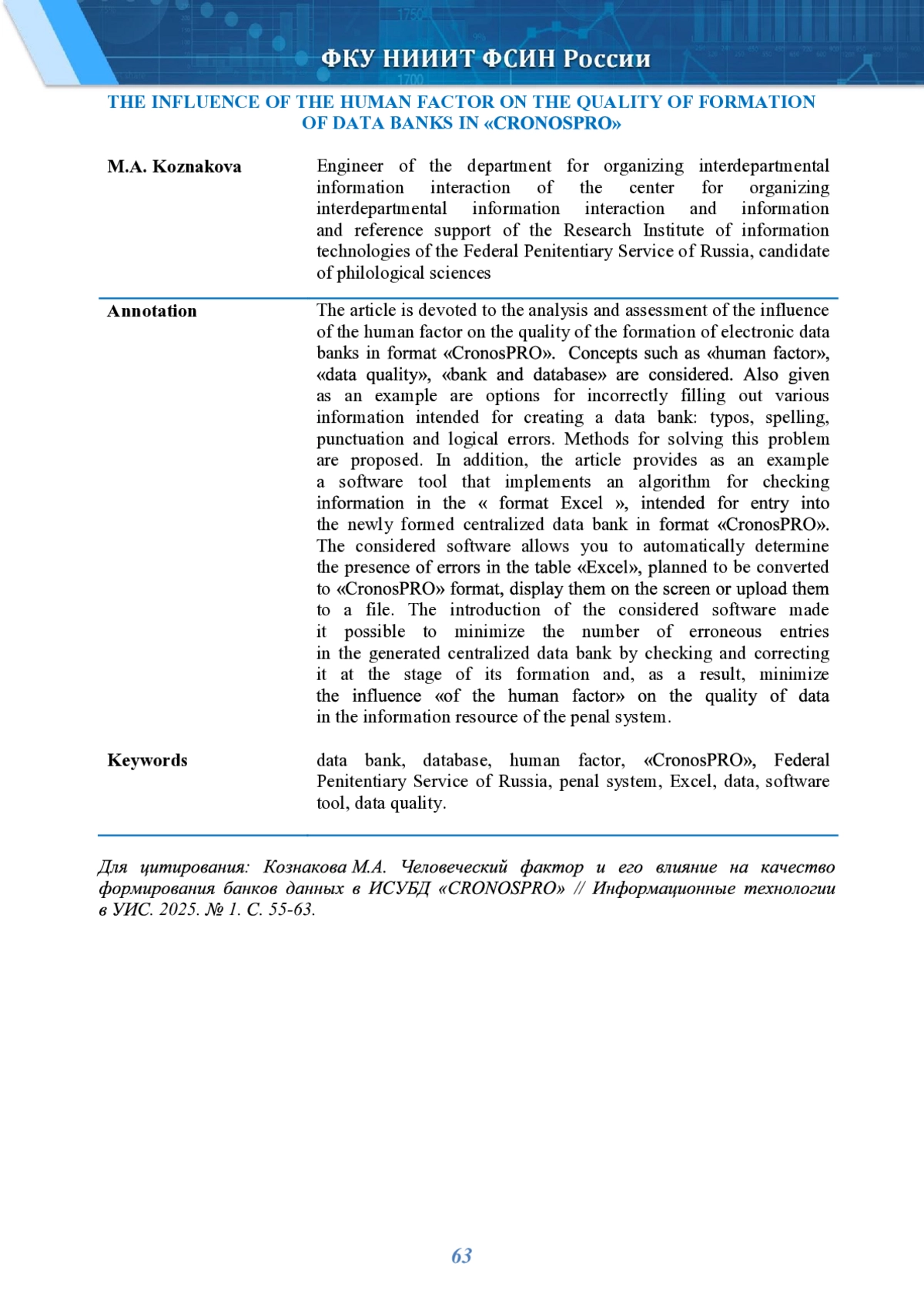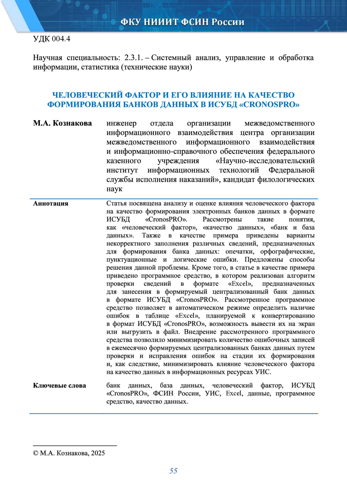Статья посвящена анализу и оценке влияния человеческого фактора на качество формирования электронных банков данных в формате ИСУБД «CronosPRO». Рассмотрены такие понятия, как «человеческий фактор», «качество данных», «банк и база данных». Также в качестве примера приведены варианты некорректного заполнения различных сведений, предназначенных для формирования банка данных: опечатки, орфографические, пунктуационные и логические ошибки. Предложены способы решения данной проблемы. Кроме того, в статье в качестве примера приведено программное средство, в котором реализован алгоритм проверки сведений в формате «Excel», предназначенных для занесения в формируемый централизованный банк данных в формате ИСУБД «CronosPRO». Рассмотренное программное средство позволяет в автоматическом режиме определить наличие ошибок в таблице «Excel», планируемой к конвертированию в формат ИСУБД «CronosPRO», возможность вывести их на экран или выгрузить в файл. Внедрение рассмотренного программного средства позволило минимизировать количество ошибочных записей в ежемесячно формируемых централизованных банках данных путем проверки и исправления ошибок на стадии их формирования и, как следствие, минимизировать влияние человеческого фактора на качество данных в информационных ресурсах УИС.