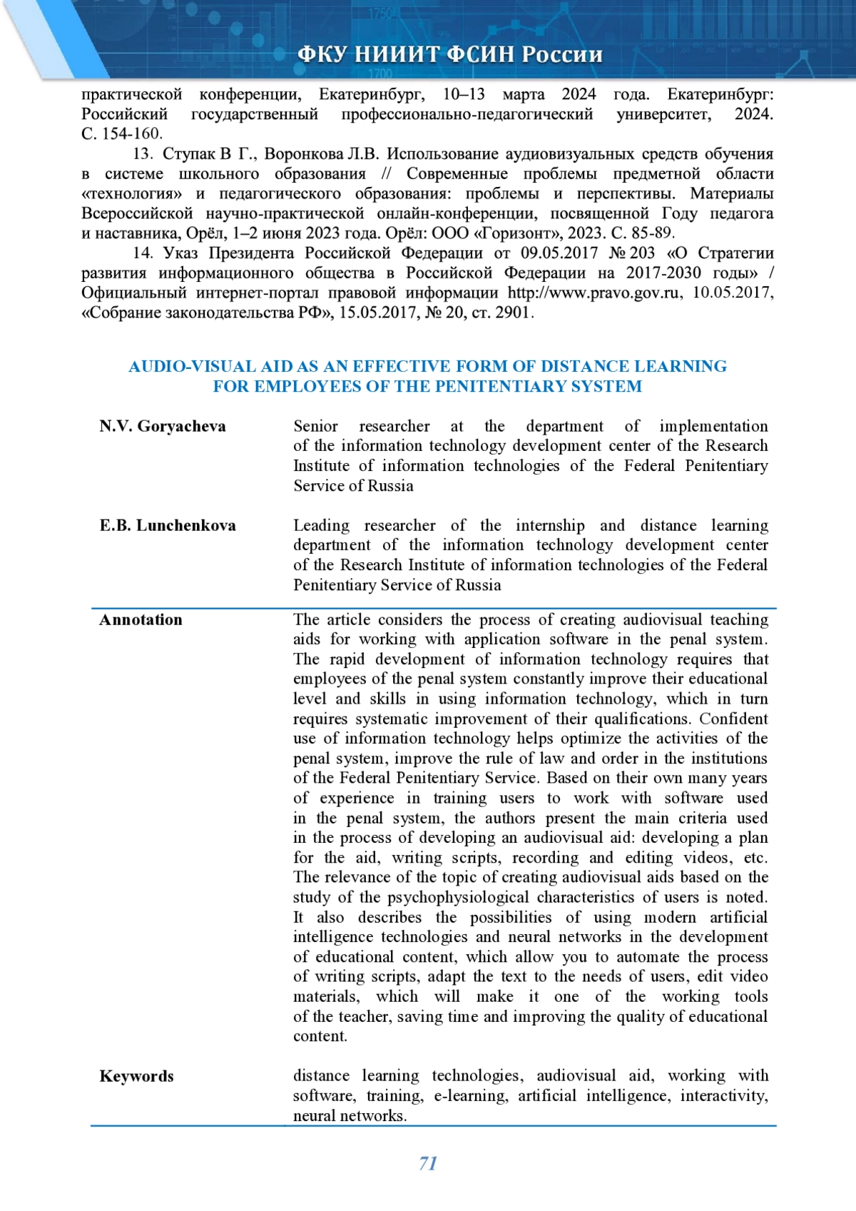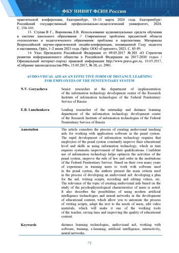 7. Лунченкова Э.Б., Горячева Н.В. Аудиовизуальные пособия как элементы информационной образовательной среды уголовно-исполнительной системы // Информационные технологии в УИС. 2021. № 2. С. 79-85. EDN: TBYXFD