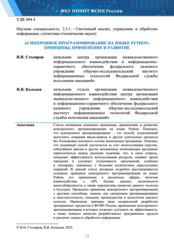 Статья посвящена основным принципам, применению и развитию асинхронного программирования на языке Python. Показано, что асинхронное программирование - это способ, позволяющий выполнять операции ввода-вывода и другие длительные процессы без блокировки основного потока выполнения программы. Описано, что указанный способ достигается за счет использования корутин, событийных циклов и других механизмов, позволяющих программе переключаться между разными задачами, что, в свою очередь, повышает эффективность использования ресурсов, снижает время ожидания и улучшает отзывчивость приложений, особенно в сценариях, связанных с большим количеством параллельных операций. В данной статье авторами подробно рассматриваются основные принципы асинхронного программирования на языке Python, его применение в различных сферах, включая взаимодействие с API, базами данных, возможности масштабируемости, а также перспективы развития данного подхода в будущем. Проведено сравнение асинхронного программирования с другими способами, такими, как синхронное программирование и многопоточность, показаны преимущества и недостатки каждого подхода. Приведены примеры ряда направлений разработки программных продуктов в ФСИН России, применение асинхронного программирования в которых позволит улучшить их эффективность, а также повысит качество разработанных программных средств и увеличит скорость обработки информации.
