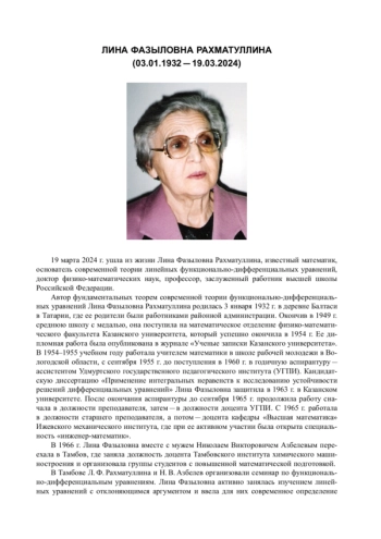 19 марта 2024 г. ушла из жизни Лина Фазыловна Рахматуллина, известный математик, основатель современной теории линейных функционально-дифференциальных уравнений, доктор физико-математических наук, профессор, заслуженный работник высшей школы Российской Федерации