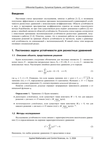 Статья: ИССЛЕДОВАНИЕ УСТОЙЧИВОСТИ ЛИНЕЙНОГО АВТОНОМНОГО РАЗНОСТНОГО УРАВНЕНИЯ С КОМПЛЕКСНЫМИ КОЭФФИЦИЕНТАМИ (2024)