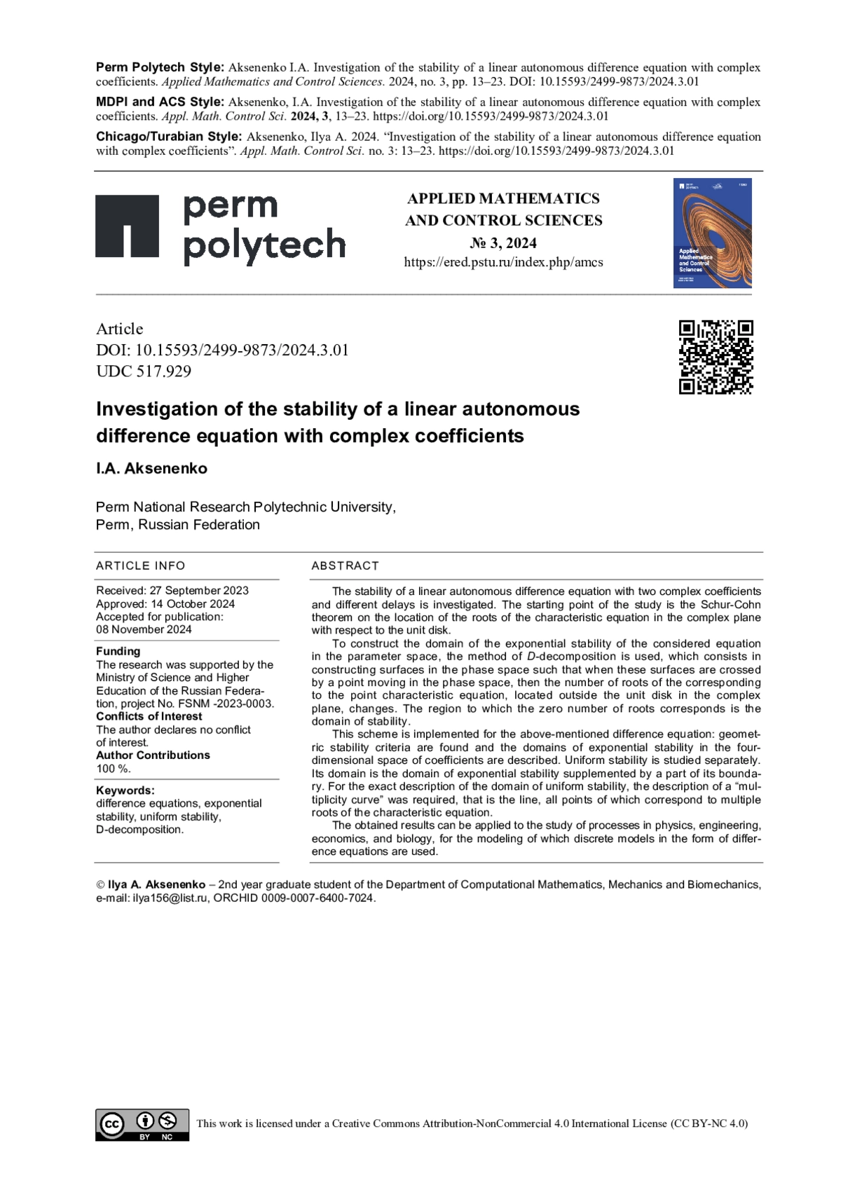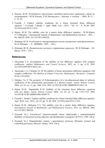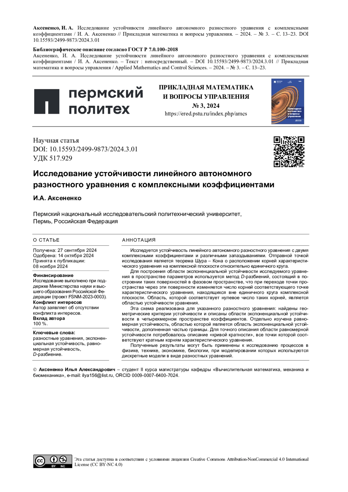 АКСЕНЕНКО И. А. ИССЛЕДОВАНИЕ УСТОЙЧИВОСТИ ЛИНЕЙНОГО АВТОНОМНОГО РАЗНОСТНОГО УРАВНЕНИЯ С КОМПЛЕКСНЫМИ КОЭФФИЦИЕНТАМИ // ПРИКЛАДНАЯ МАТЕМАТИКА И ВОПРОСЫ УПРАВЛЕНИЯ. 2024. № 3