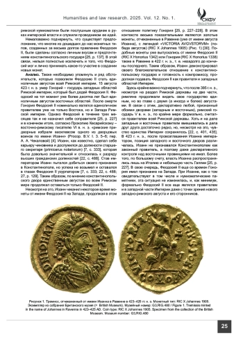 Анализ. Автор отмечает, что целый ряд монет, отчеканенных от имени Феодосия II и Валентиниана III, как в Западной, так и в Восточной части Римского государства являются наглядным отражением недолгого «воссоединения» обоих частей Империи во главе Феодосием II, который на несколько месяцев стал единоличным августом во всем Римском мире. Также автор обращает внимание, на то, что Феодосий II воспринимался и позиционировался в хронике западно-римского хрониста V в. н. э. Идация как «монарх», т. е. как единоличный правитель.