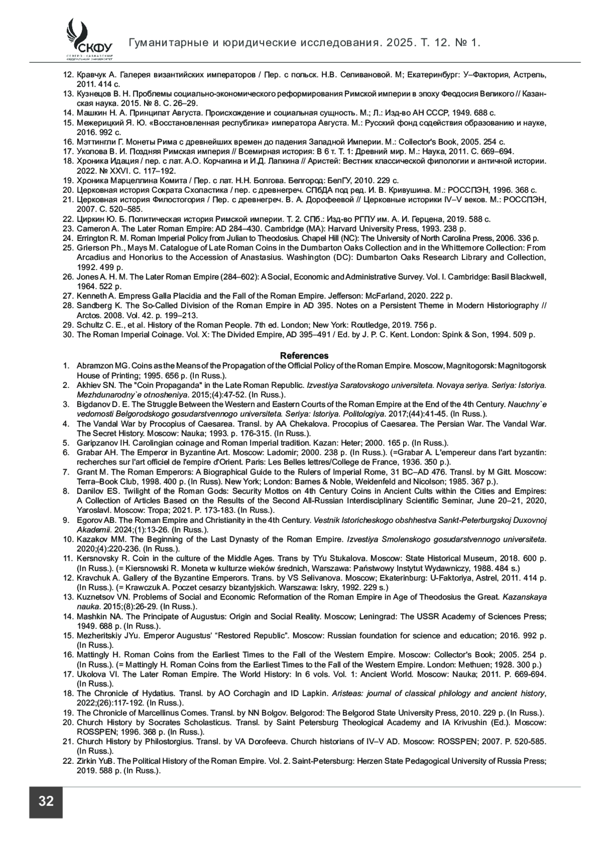 9. Егоров А. Б. Римская Империя и христианство в IV в. // Вестник Исторического общества Санкт-Петербургской Духовной Академии. 2024. № 1 (17). С. 13-26.
