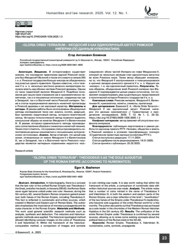 Введение. В историографии существует мнение, что последним правителем единой Римской империи был Феодосий I Великий и после его смерти в начале 395 г. н. э. Римское государство больше никогда не объединялось под властью одного правителя. Однако известно, что в течение V в. н. э. несколько восточно-римских императоров получали власть над обоими частями Римской державы. Одним из таких правителей являлся Феодосий II. Подобное положение дел нашло свое отражение как в нумизматических памятниках, так и в письменных источниках, созданных как как в Западной, так и в Восточной части Римской империи. Также в статье подчеркивается важность монетной пропаганды в Римской державы и ее массовый характер.