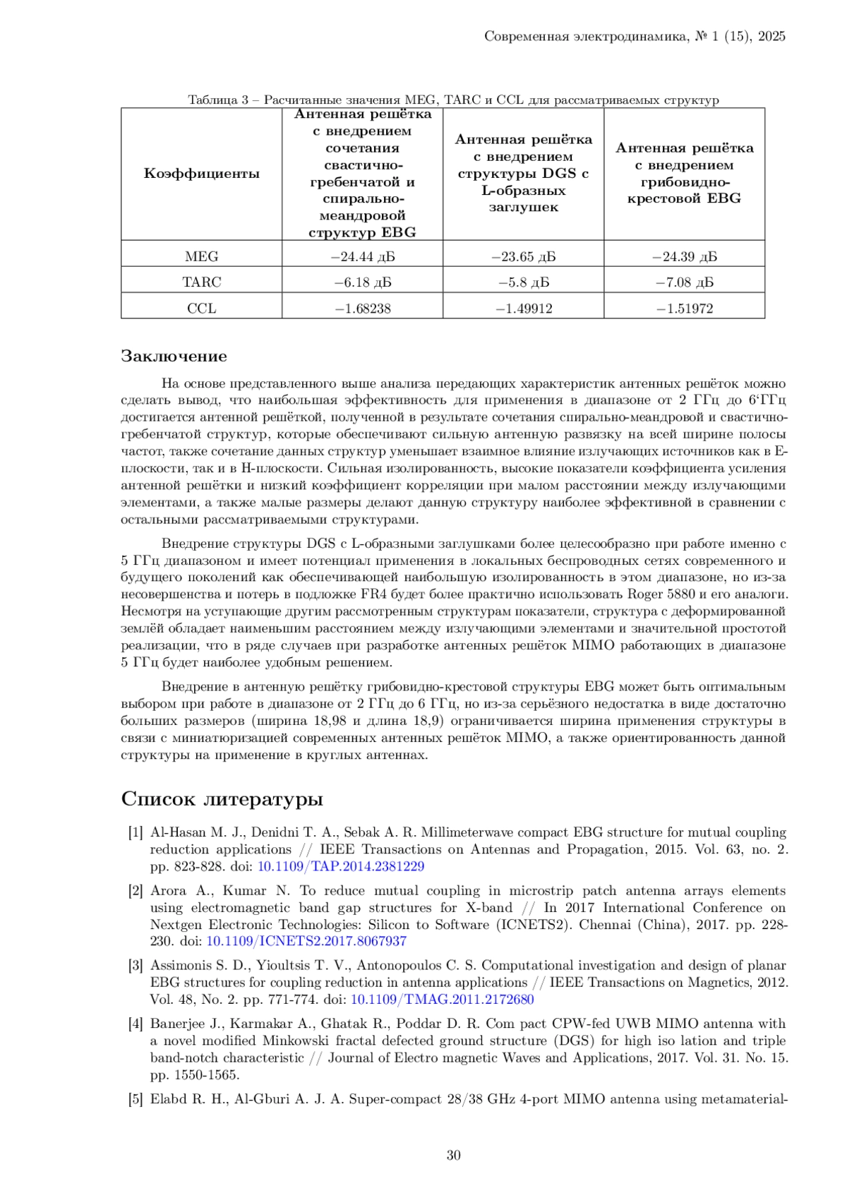 1. Al-Hasan M. J., Denidni T. A., Sebak A. R. Millimeterwave compact EBG structure for mutual coupling reduction applications // IEEE Transactions on Antennas and Propagation, 2015. Vol. 63, no. 2. pp. 823-828. DOI: 10.1109/TAP.2014.2381229