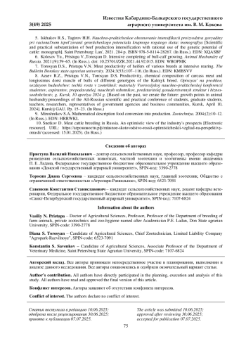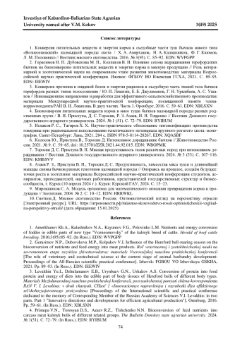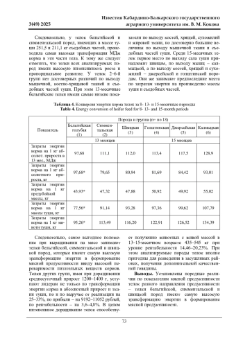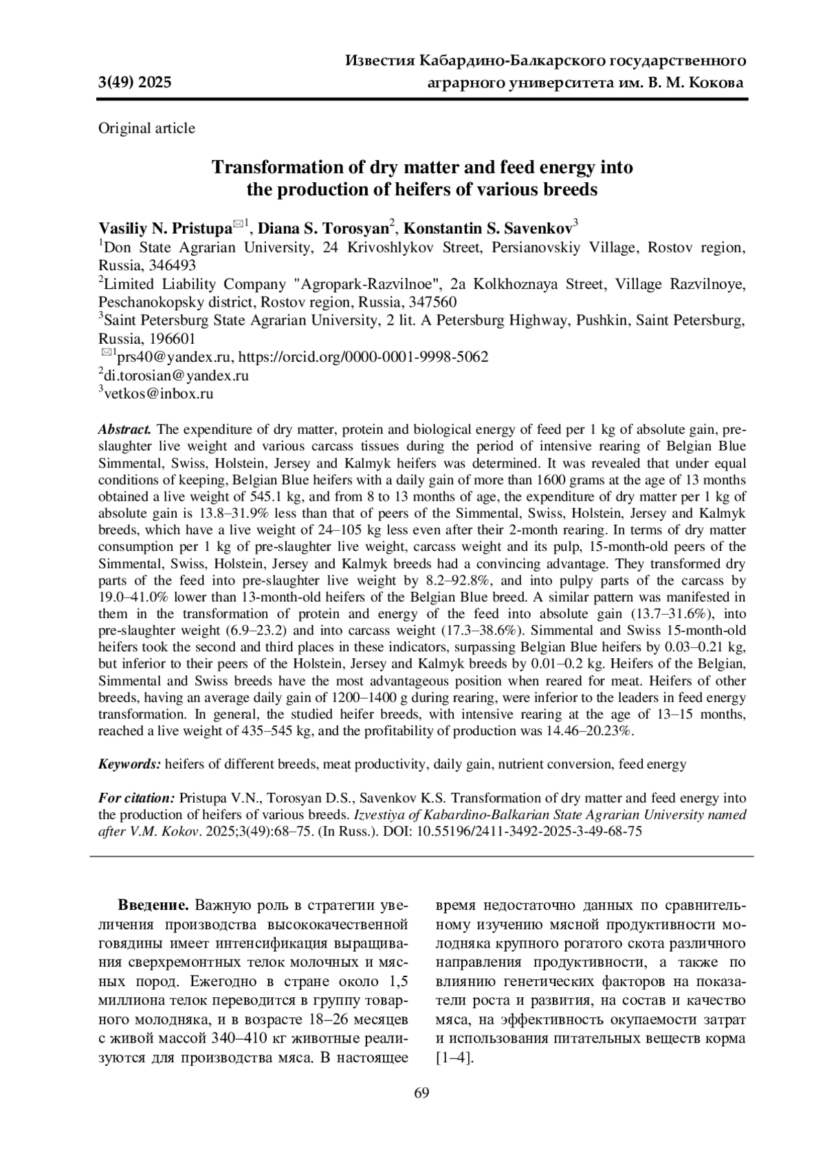 ПРИСТУПА В. Н., ТОРОСЯН Д. С., САВЕНКОВ К. С. ТРАНСФОРМАЦИЯ СУХОГО ВЕЩЕСТВА И ЭНЕРГИИ КОРМА В ПРОДУКЦИЮ ТЕЛОК РАЗЛИЧНЫХ ПОРОД // ИЗВЕСТИЯ КАБАРДИНО-БАЛКАРСКОГО ГОСУДАРСТВЕННОГО АГРАРНОГО УНИВЕРСИТЕТА ИМ. В. М. КОКОВА. 2025. № 3 (49)