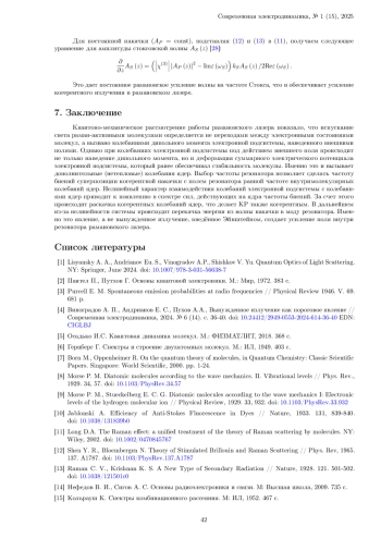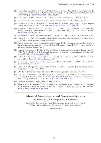 24. Neuman T., Aizpurua J., Esteban R. Quantum theory of surface-enhanced resonant Raman scattering (SERRS) of molecules in strongly coupled plasmon-exciton systems // Nanophotonics, 2020. Vol. 9(2). p. 295-308. DOI: 10.1515/nanoph-2019-0336