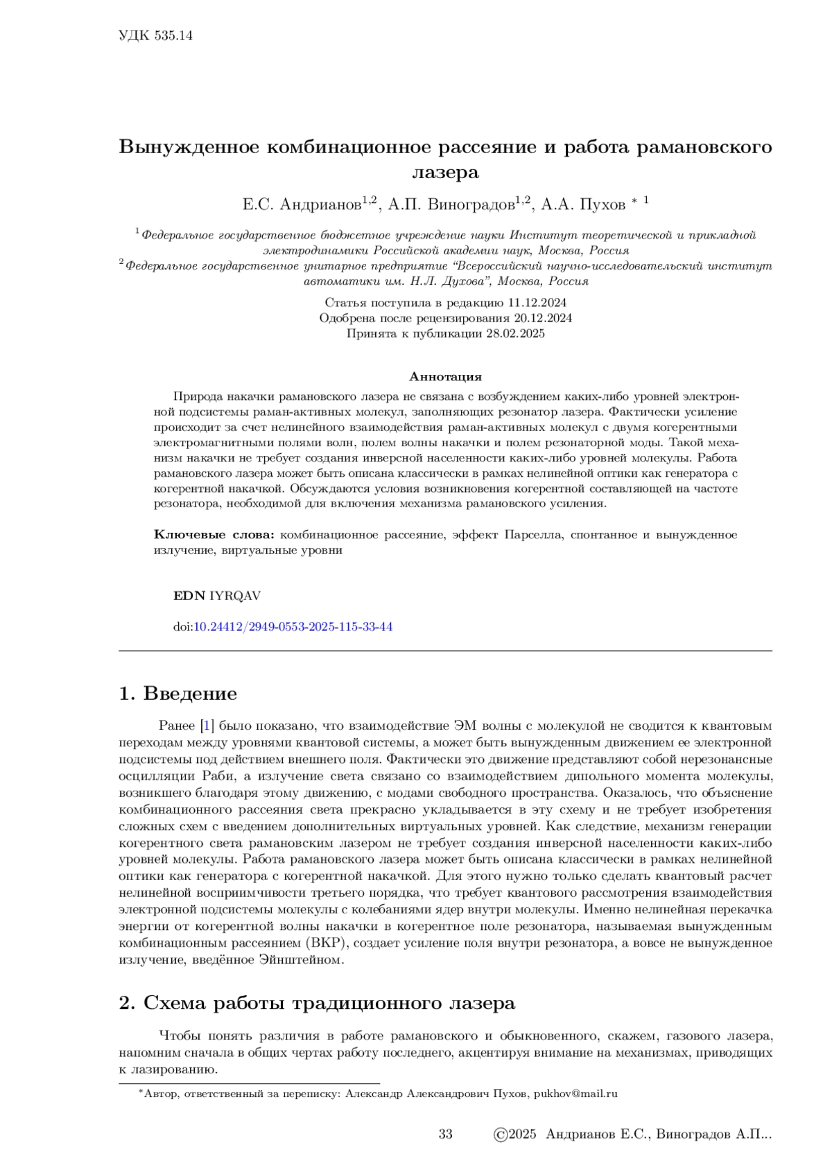 4. Виноградов А. П., Андрианов Е. С., Пухов А.А., Вынужденное излучение как пороговое явление // Современная электродинамика, 2024. № 6 (14). с. 36-40. DOI: 10.24412/2949-0553-2024-614-36-40