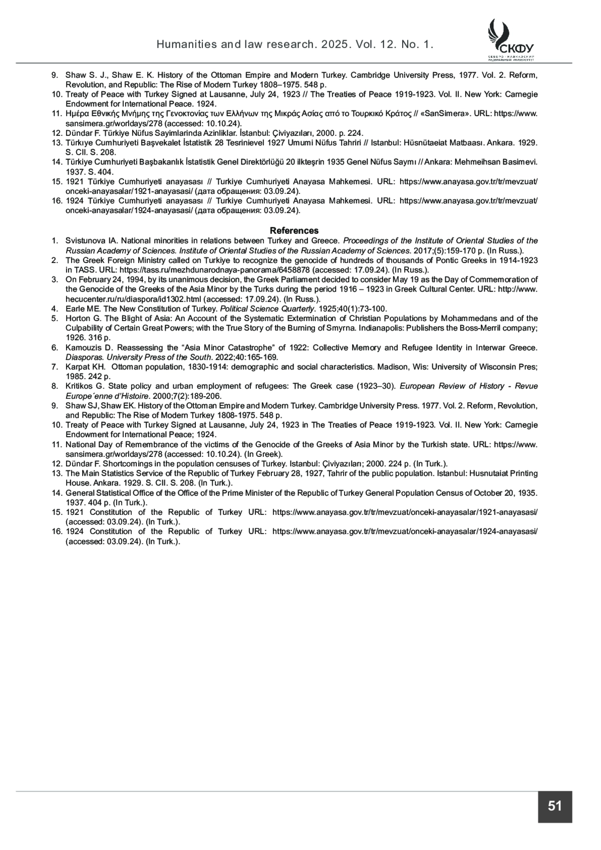 6. Kamouzis D. Reassessing the “Asia Minor Catastrophe” of 1922: Collective Memory and Refugee Identity in Interwar Greece // Diasporas. University Press of the South. 2022. Vol. 40. P. 165-169.
