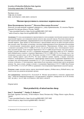В статье рассматривается перспективность использования генетических ресурсов породы джалгинский меринос для повышения мясных качеств овец сальской породы. Получены животные новой генетической комбинации, сформированной путем объединения генотипов пород сальский и джалгинский меринос. Дана оценка их биологических и продуктивных качеств на фоне исходной популяции сальских овец. Молодняк улучшенных генотипов характеризовался более высокими абсолютными и относительными показателями мясной продуктивности. Максимальная убойная масса отмечена у помесного молодняка (1/2СА+1/2ДЖ) (17,32 кг), что на 6,8% больше, чем у чистопородного молодняка сальской породы. Туши помесных баранчиков (1/2СА+1/2ДЖ) весили больше, чем туши чистопородных сальских животных, на 6,4%, а содержание внутреннего жира было выше на 10,1%. Наибольший убойный выход отмечен у помесных баранчиков (1/2СА+1/2ДЖ) (45,2%), что больше, чем у чистопородных сальских ягнят, на 0,6%. Молодняк генотипа (1/2СА+1/2ДЖ) отличался наибольшим выходом отрубов первого сорта (93,47%). По массе наиболее ценных отрубов, a именно лопаточно-спинного, тазобедренного и поясничного, зафиксировано превосходство полукровных баранчиков (оно составило над чистопородными сальскими 6,4; 6,7; 6,8% соответственно). Животные улучшенных генотипов отличались от чистопородных сверстников более высокими показателями массы внутренних органов. Так, масса легких, сердца и печени у полукровных баранчиков (1/2СА+1/2ДЖ) была больше на 5,9 (Р>0,999); 7,3 и 4,2% (Р>0,999) по сравнению с чистопородными баранчиками сальской породы.