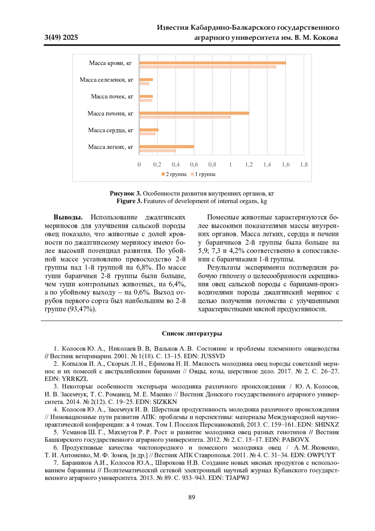 ЗАСЕМЧУК И. В., КОЛОСОВА Н. Н. МЯСНАЯ ПРОДУКТИВНОСТЬ ПОМЕСНЫХ МЕРИНОСОВЫХ ОВЕЦ // ИЗВЕСТИЯ КАБАРДИНО-БАЛКАРСКОГО ГОСУДАРСТВЕННОГО АГРАРНОГО УНИВЕРСИТЕТА ИМ. В. М. КОКОВА. 2025. № 3 (49)