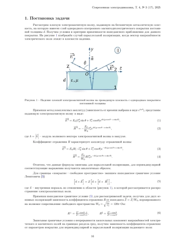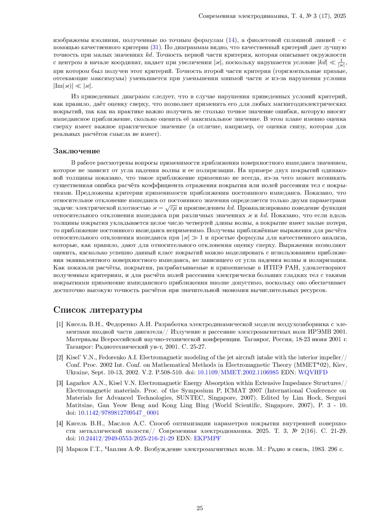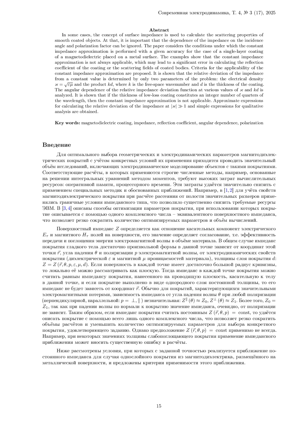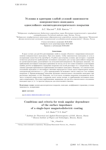 Статья: УСЛОВИЯ И КРИТЕРИИ СЛАБОЙ УГЛОВОЙ ЗАВИСИМОСТИ ПОВЕРХНОСТНОГО ИМПЕДАНСА ОДНОСЛОЙНОГО МАГНИТОДИЭЛЕКТРИЧЕСКОГО ПОКРЫТИЯ (2025)