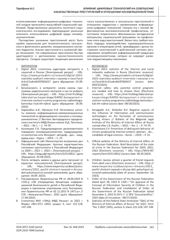 Статья: ВЛИЯНИЕ ЦИФРОВЫХ ТЕХНОЛОГИЙ НА СОВЕРШЕНИЕ НАСИЛЬСТВЕННЫХ ПРЕСТУПЛЕНИЙ В ОТНОШЕНИИ НЕСОВЕРШЕННОЛЕТНИХ (2023)