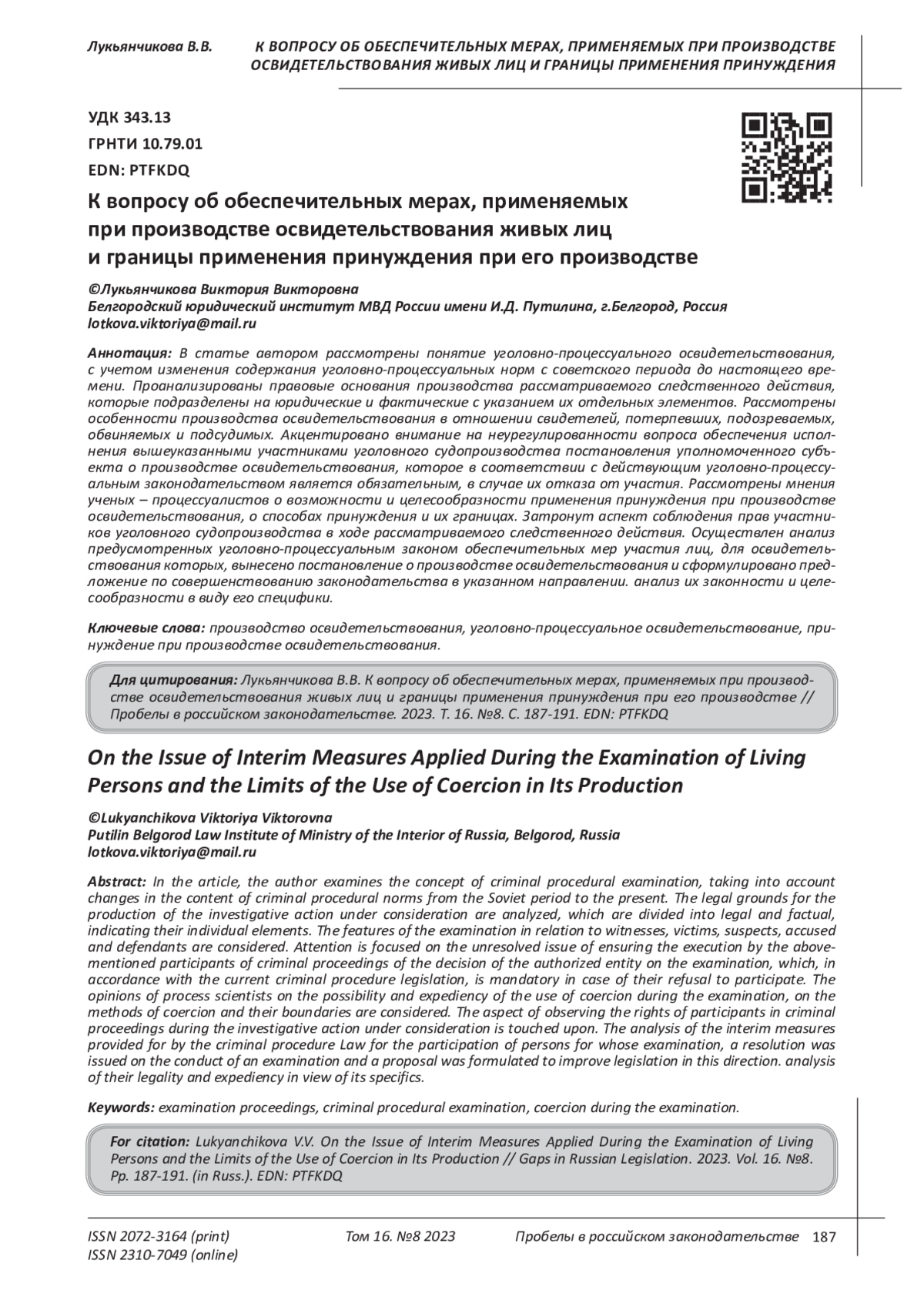 Kudryavtseva A.V. Examination according to the Code of Criminal Procedure of the Russian Federation // International legal readings: Materials of scientific and practical conf. Omsk, 2004. p. 247.