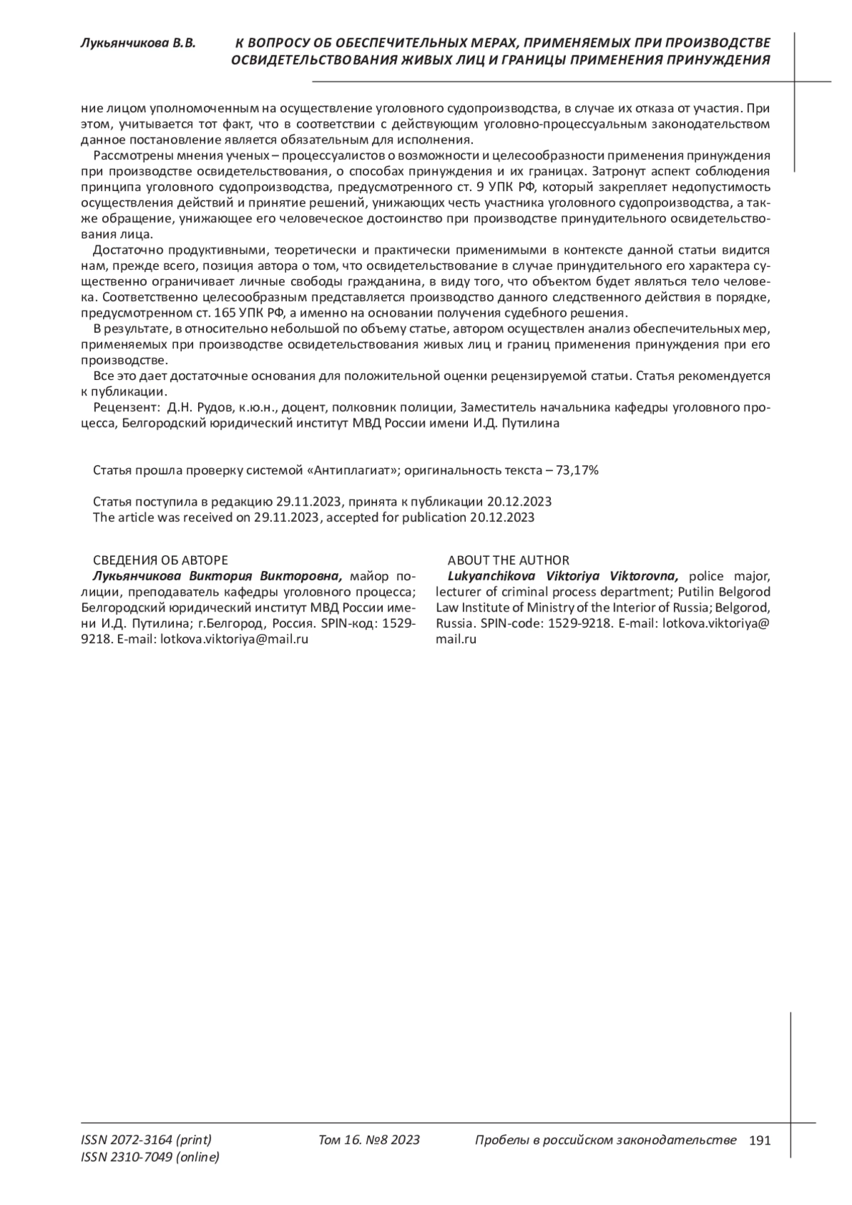 1. Кудрявцева А.В. Освидетельствование по УПК Российской Федерации // Международные юридические чтения: Мат-лы науч.-практ. конф. Омск, 2004. С. 247. EDN: SIWWHR